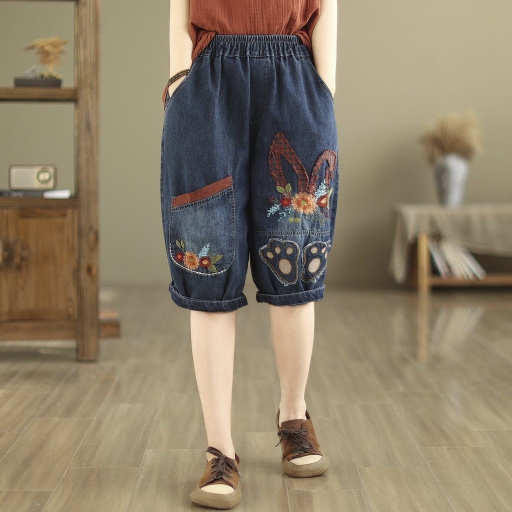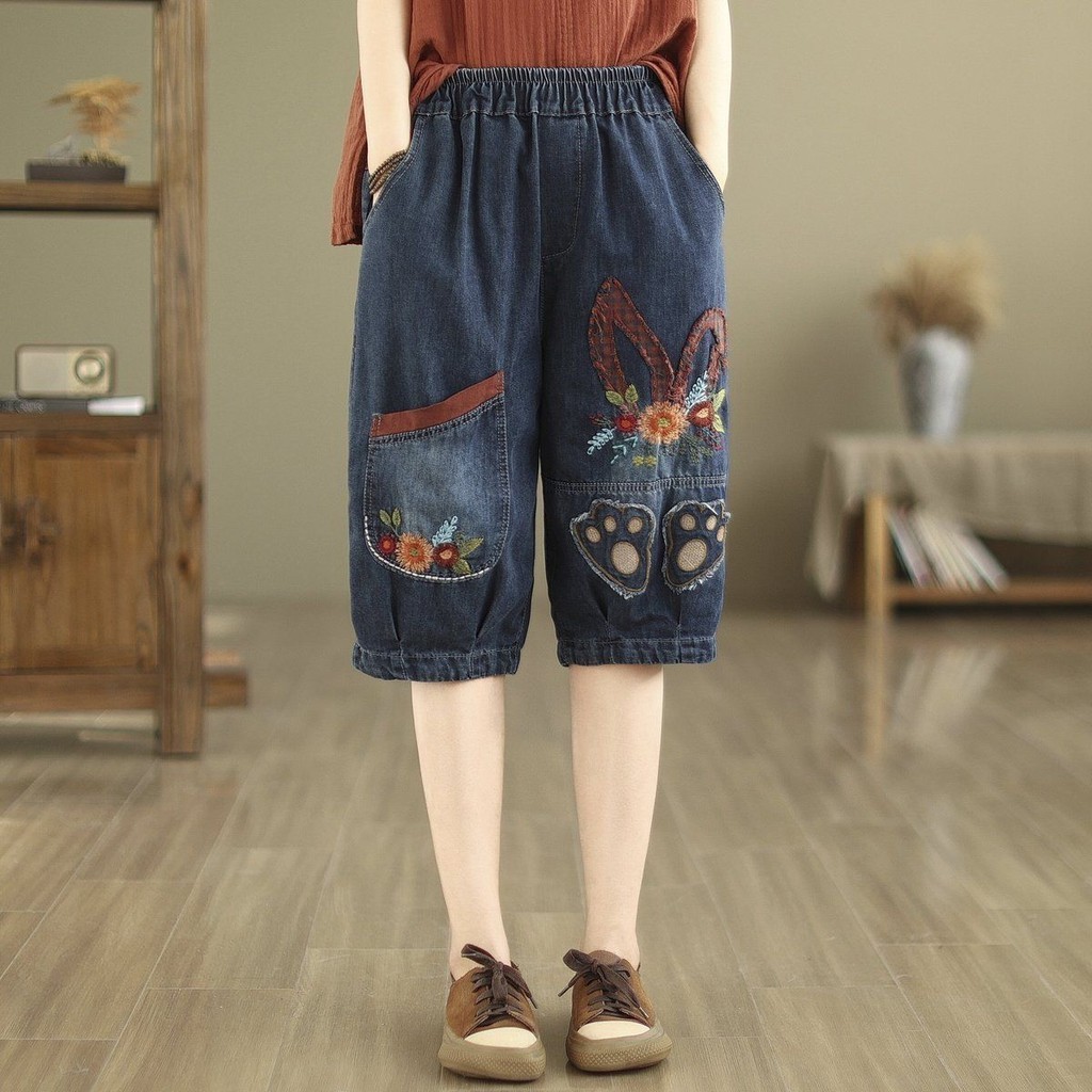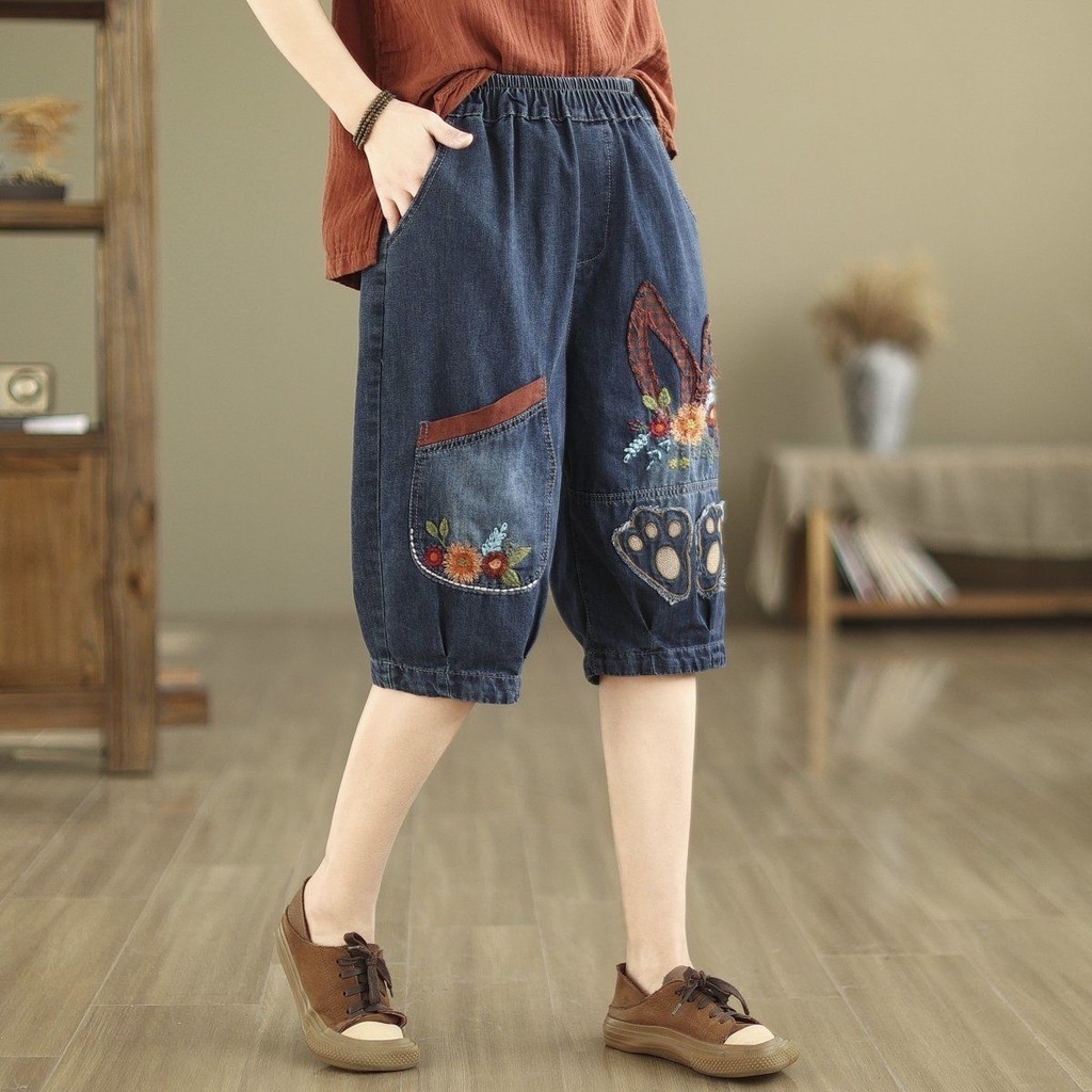 กางเกงยีนส์ผู้หญิง2024ฤดูร้อนเวอร์ชั่นเกาหลียืดหยุ่นเอวสูงขนาดบวกสบายๆอเนกประสงค์ปักหลวมห้ากางเกงไตรมาส