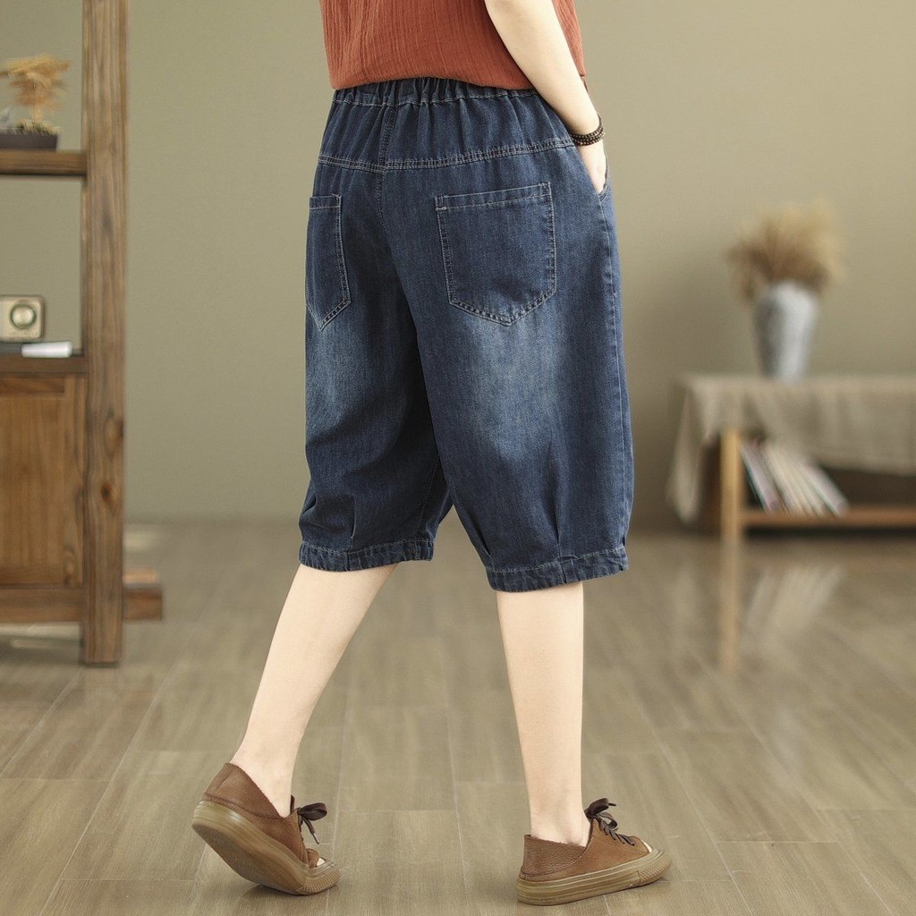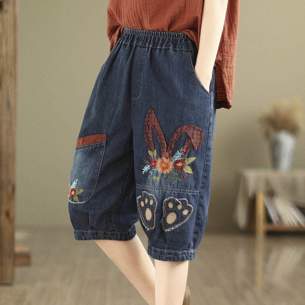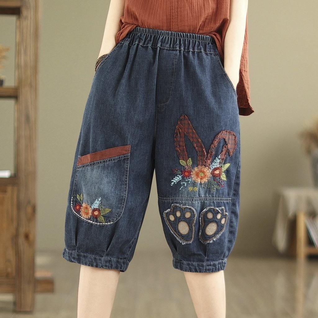 กางเกงยีนส์ผู้หญิง2024ฤดูร้อนเวอร์ชั่นเกาหลียืดหยุ่นเอวสูงขนาดบวกสบายๆอเนกประสงค์ปักหลวมห้ากางเกงไตรมาส