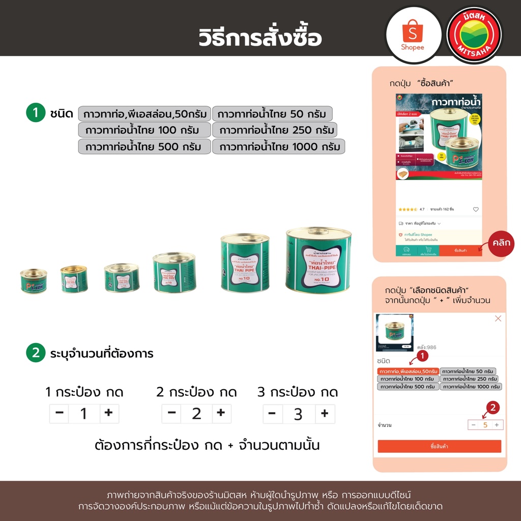 หากลูกค้าต้องการกาวทาท่อน้ำไทย 50 กรัม จำนวน 5 กระป๋องให้ลูกค้ากดปุ่ม “ซื้อสินค้า” จากนั้นทำการเลือกชนิดของสินค้า กดปุ่ม “กาวทาท่อน้ำไทย 50 กรัม” จากนั้นกดสั่งเป็นจำนวน +5 ทางร้านจะเตรียม กาวทาท่อน้ำไทย 50 กรัมจำนวน 5 กระป๋อง เป็นต้น
