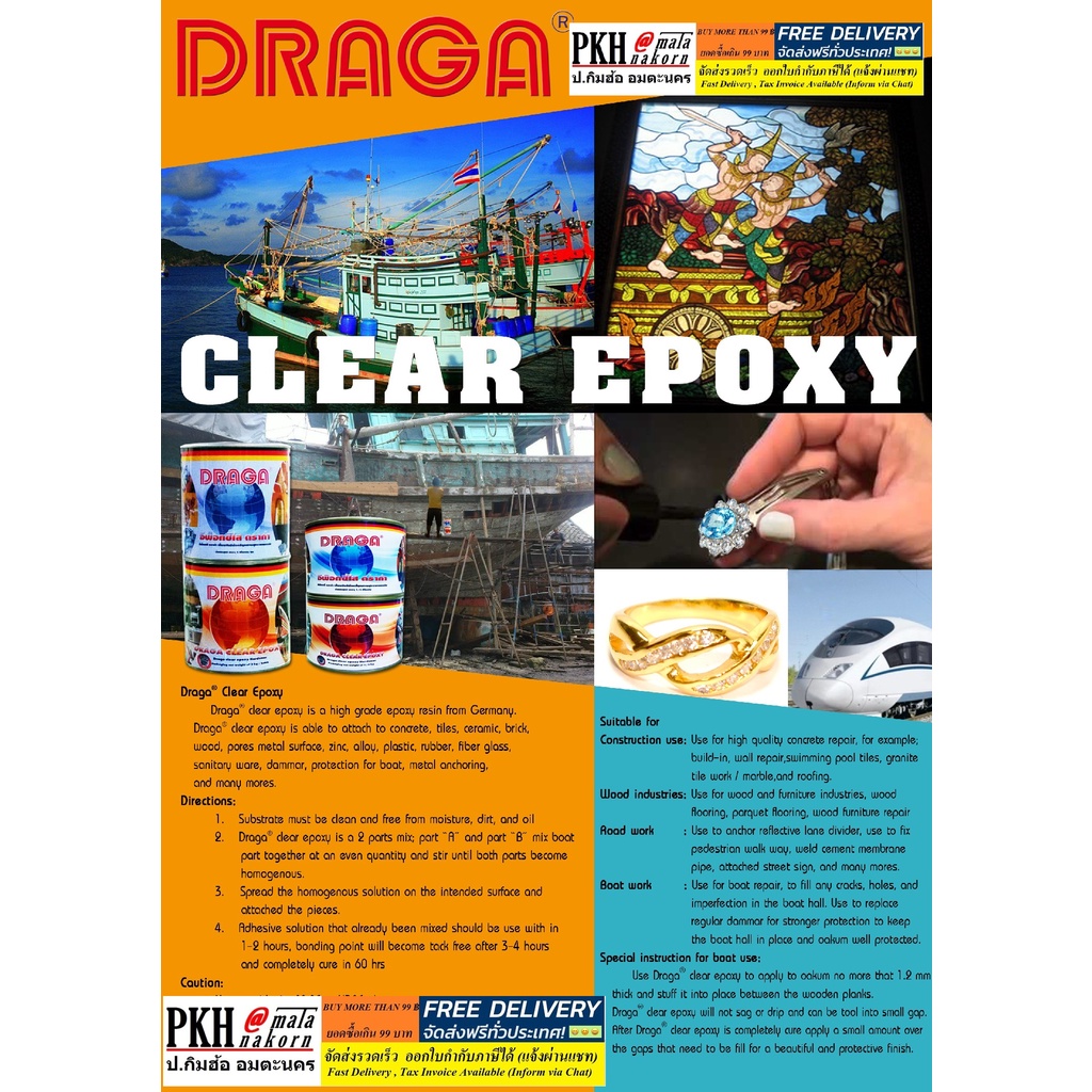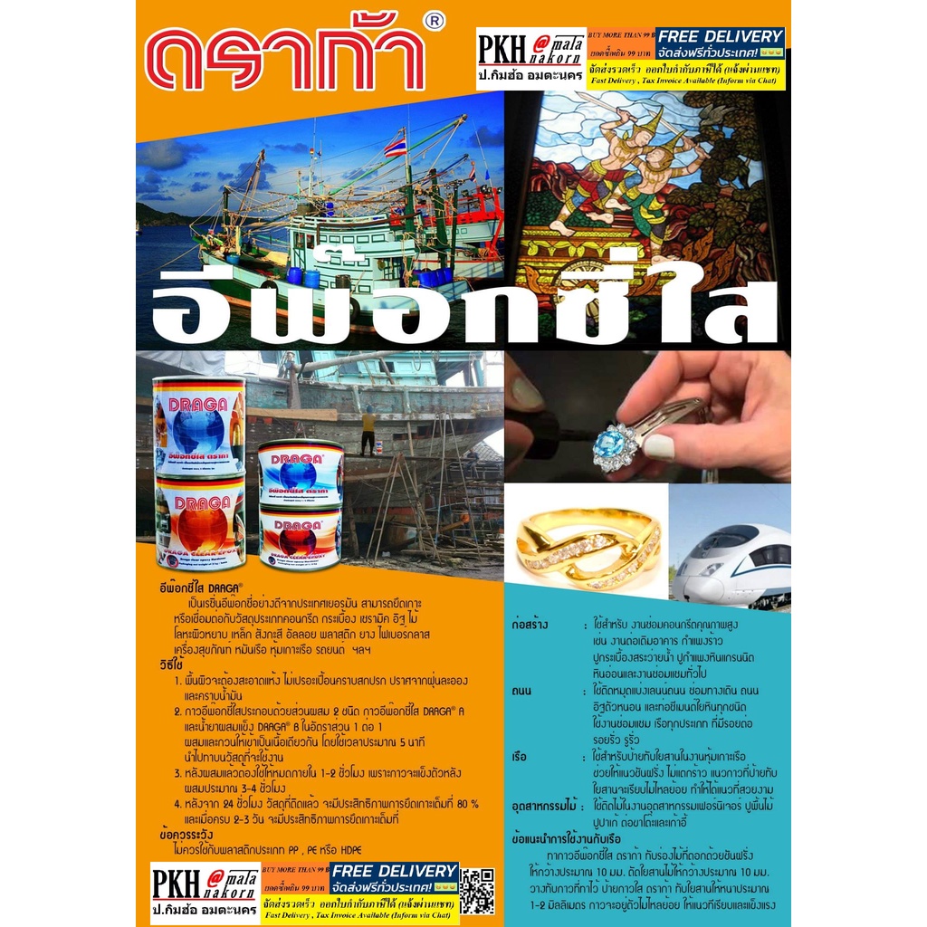 ข้อแนะนำ :1.หลังผสมแล้ว ต้องใช้ให้หมดภายใน 1 – 2 ชั่วโมง เพราะกาวจะแข็งตัวหลังผสมประมาณ 3 – 4 ชั่วโมง 2.เมื่อใช้สำหรับงานเรือ ทากาวอีพ๊อกซี่ใส ดราก้าทับร่องไม้ที่ตอกด้วยชันฝรั่งให้กว้างประมาณ 10 มม. ตัดใยสานให้กว้างประมาณ 10 มม. วางทับกาวที่ทาไว้ป้ายกาวอีพ๊อกซี่ใส ดราก้าทับใยสานให้หนาประมาณ 1 – 2 มม. กาวจะอยู่ตัวไม่ไหลย้อยให้แนวที่เรียบและแข็งแรง
