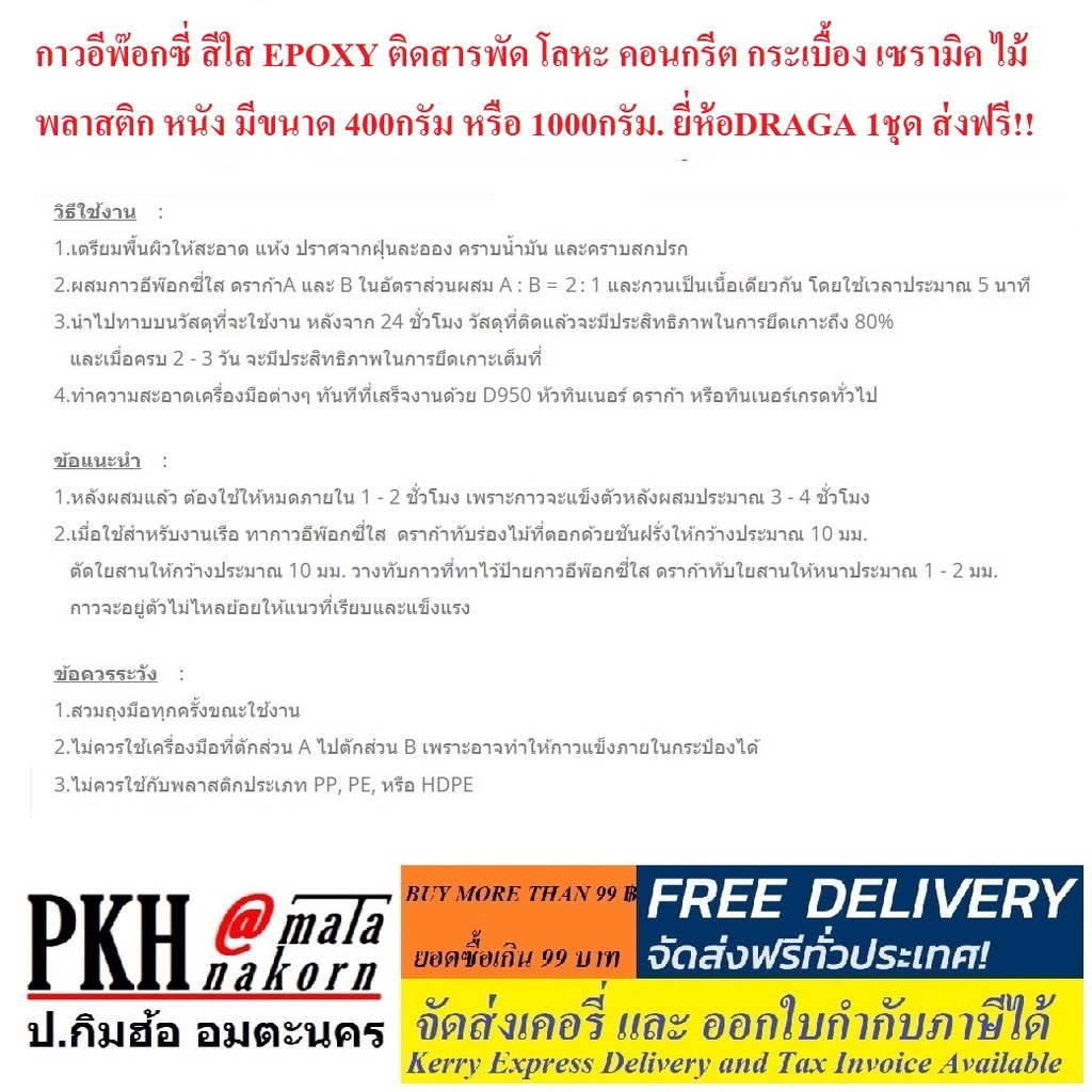 วิธีใช้งาน :1.เตรียมพื้นผิวให้สะอาด แห้ง ปราศจากฝุ่นละออง คราบน้ำมัน และคราบสกปรก 2.ผสมกาวอีพ๊อกซี่ใส ดราก้าA และ B ในอัตราส่วนผสม A : B = 2 : 1 และกวนเป็นเนื้อเดียวกัน โดยใช้เวลาประมาณ 5 นาที 3.นำไปทาบบนวัสดุที่จะใช้งาน หลังจาก 24 ชั่วโมง วัสดุที่ติดแล้วจะมีประสิทธิภาพในการยึดเกาะถึง 80% และเมื่อครบ 2 – 3 วัน จะมีประสิทธิภาพในการยึดเกาะเต็มที่ 4.ทำความสะอาดเครื่องมือต่างๆ ทันทีที่เสร็จงานด้วย D950 หัวทินเนอร์ ดราก้า หรือทินเนอร์เกรดทั่วไป
