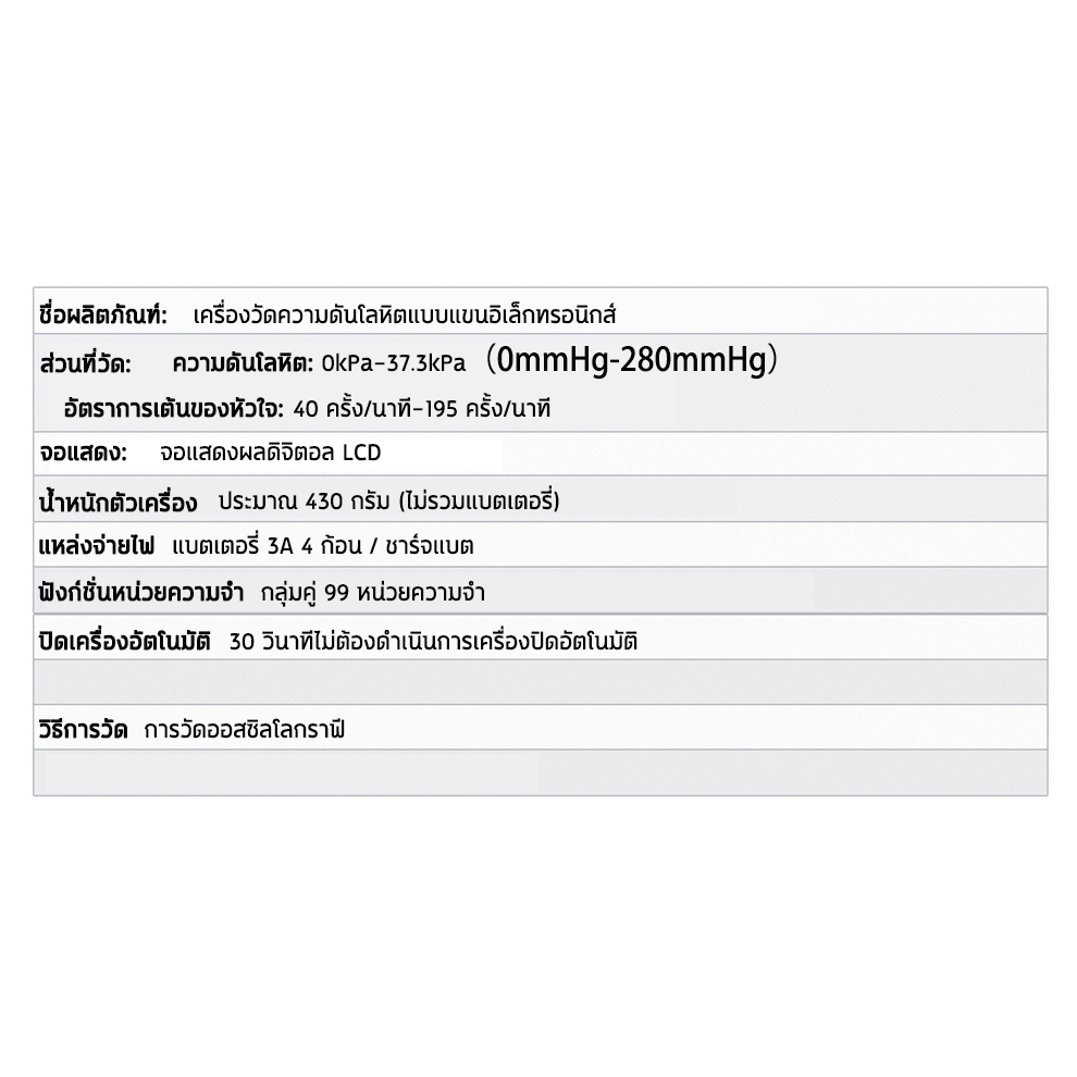 – ช่วงค่าความคาดเคลื่อน : ความดัน +/- 3mmHg อัตราการเต้นหัวใจ(ชีพจร) +/- 5%