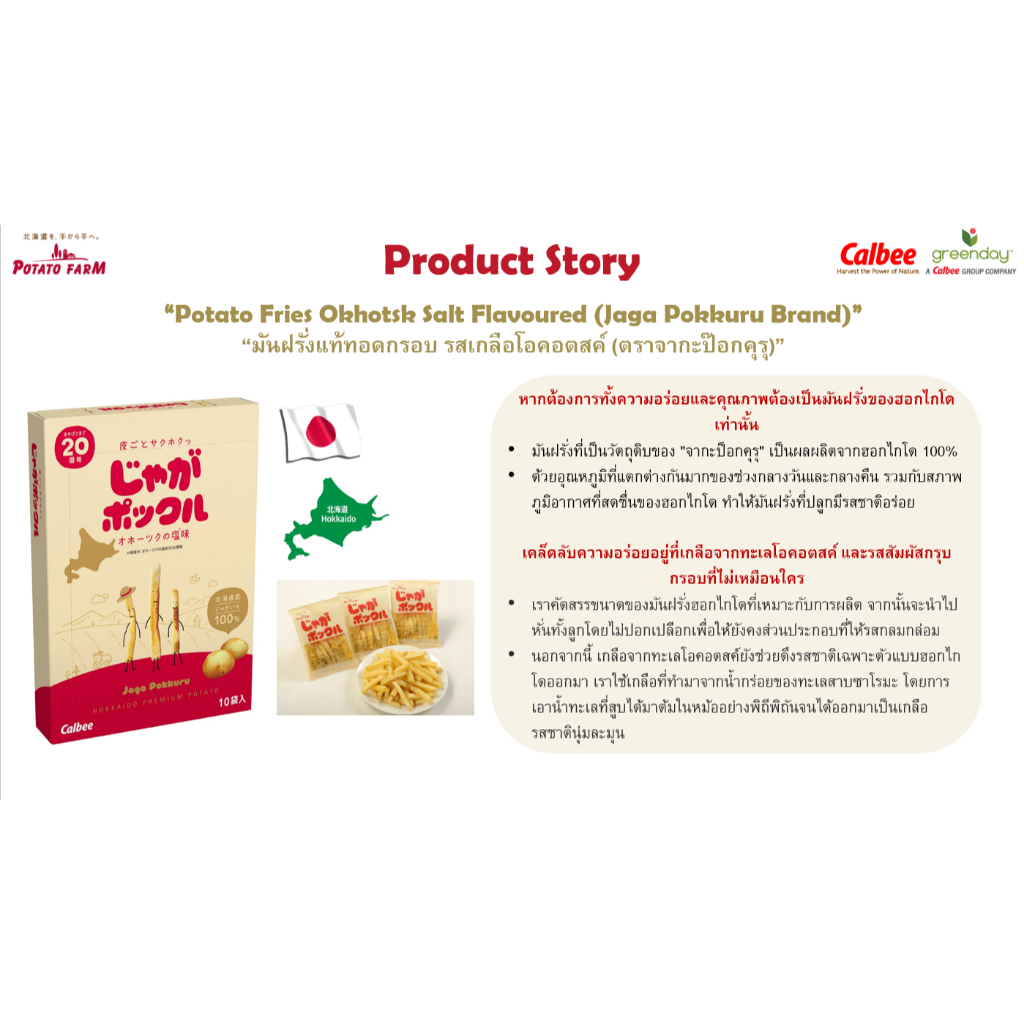 Jaga Pokkuru Potato Fries Okhotsk Salt Flavoured 180g. / จากะป๊อกคุรุ มันฝรั่งแท้ทอดกรอบ รสเกลือโอคอตสค์ 180ก. มันฝรั่งแท้ทอดกรอบ รสเกลือโอคอตสค์ เป็นมันฝรั่งแท้ของฮอกไกโด 100% ผลิตจากเกลือทะเลน้ำลึกจากทะเล โอคอตสค์ฮอกไกโด ประเทศญี่ปุ่น หมวดหมู่ Chips & Crisps รีวิว ยังไม่มีบทวิจารณ์ มาเป็นคนแรกที่วิจารณ์ “จากะป๊อกคุรุ มันฝรั่งแท้ทอดกรอบ รสเกลือโอคอตสค์ 180ก./Jaga Pokkuru Potato Fries Okhotsk Salt Flavoured 180g.”Cancel Replyอีเมลของคุณจะไม่แสดงให้คนอื่นเห็น ช่องข้อมูลจำเป็นถูกทำเครื่องหมาย *การให้คะแนนของคุณ * ให้คะแนน… ดีเยี่ยม ดี ปานกลาง ค่อนข้างแย่ แย่มาก Name *Email *บทวิจารณ์ของคุณ * บันทึกชื่อ, อีเมล และชื่อเว็บไซต์ของฉันบนเบราว์เซอร์นี้ สำหรับการแสดงความเห็นครั้งถัดไป ส่ง