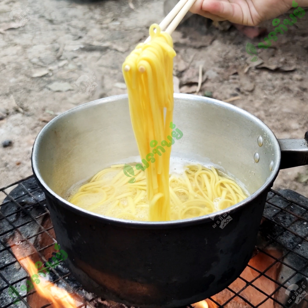 -ต้มน้ำให้เดือดแล้วใส่เส้นหมี่ลงในน้ำประมาณ 3-5 นาที