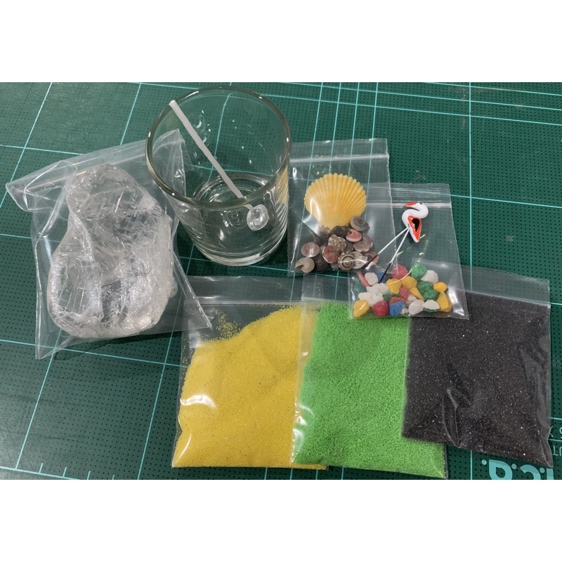 แก้วเป๊ก 1 ใบ เทียนเจล1ก้อน ทรายสี 3 สี เปลือกหอย หินสี ตุ๊กตาจิ่ว ไส้เทียน ช่อนตักทราย ที่ยึดไส้เทียน