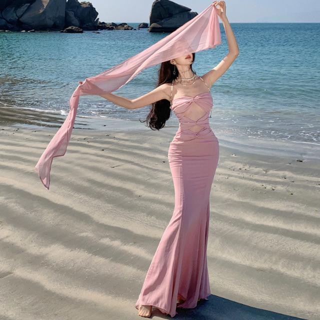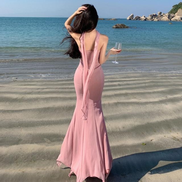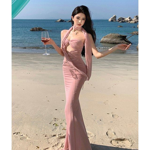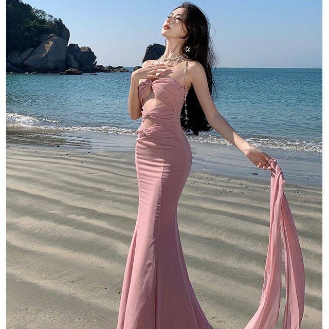 ชุดเดรสยาวสไตล์ฝรั่งเศสหรูหราเบา สวยงาม นิช โปร่ง ไม่มีสาย ชุดนางเงือก ชุดงานเลี้ยงวันเกิด