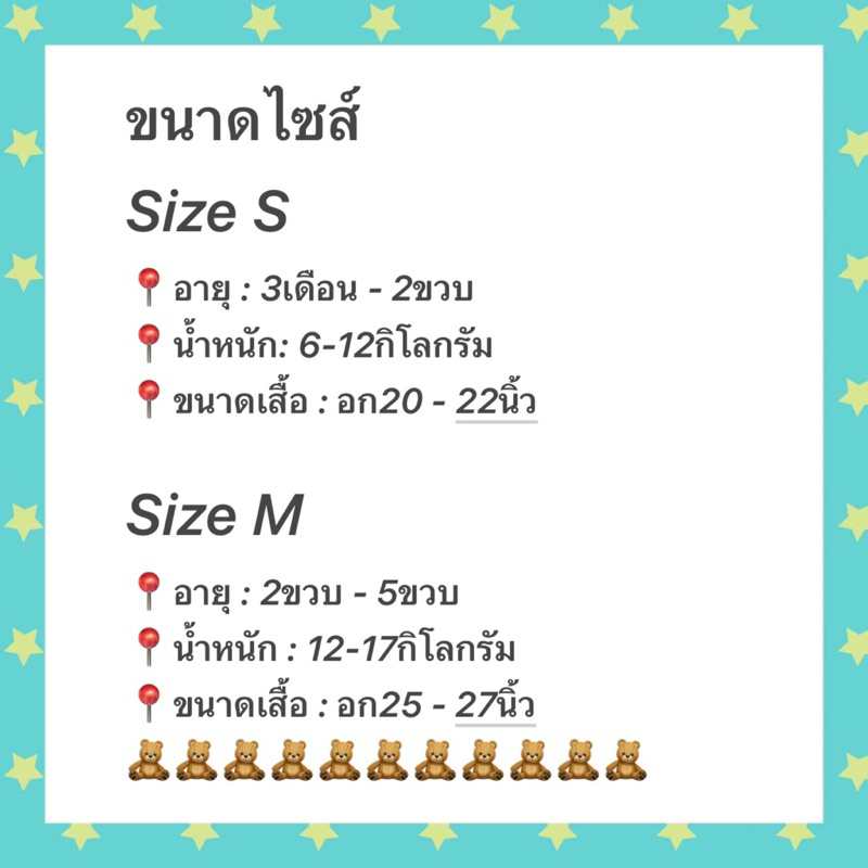 Size M: อายุ 2ขวบ – 5ขวบ อก25 – 27นิ้ว