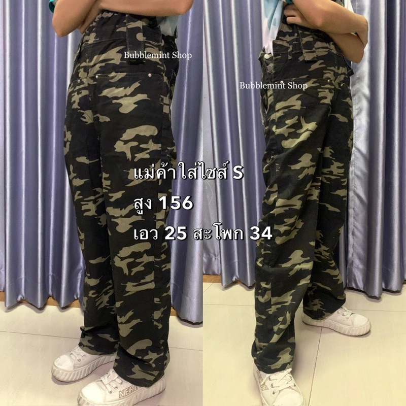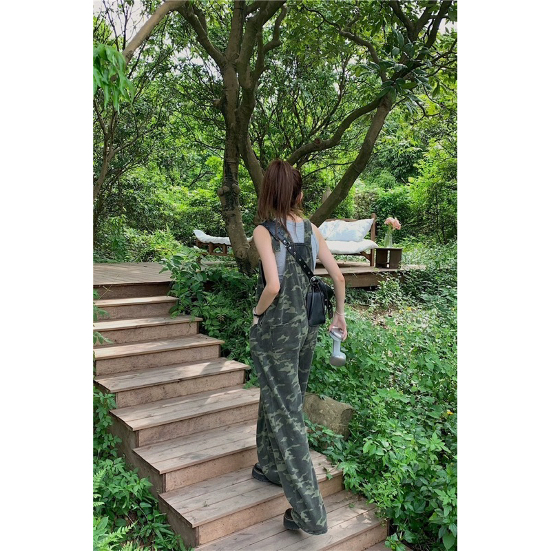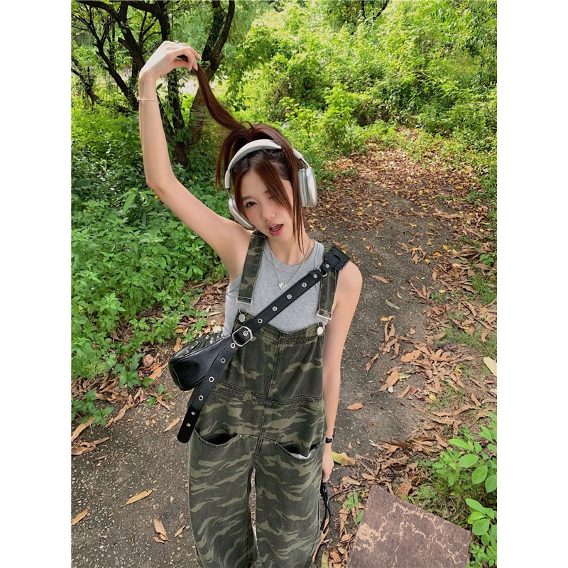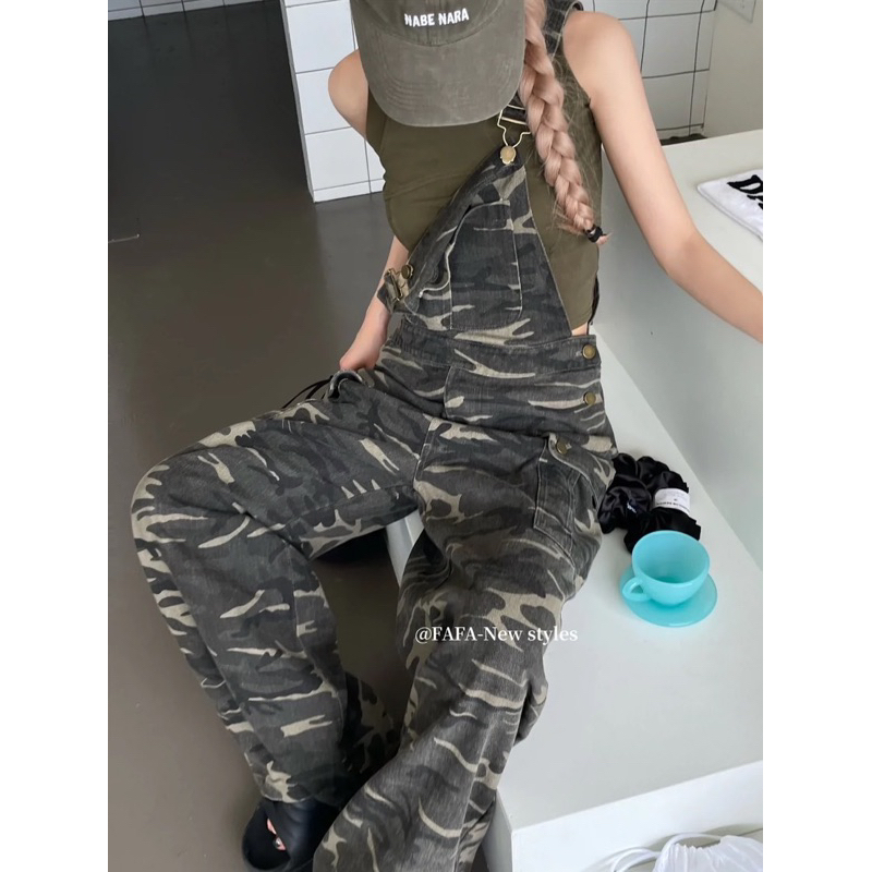 ชุดเอี๊ยมกางเกง เอวสูง ลายพราง ทรงหลวม สไตล์อเมริกัน