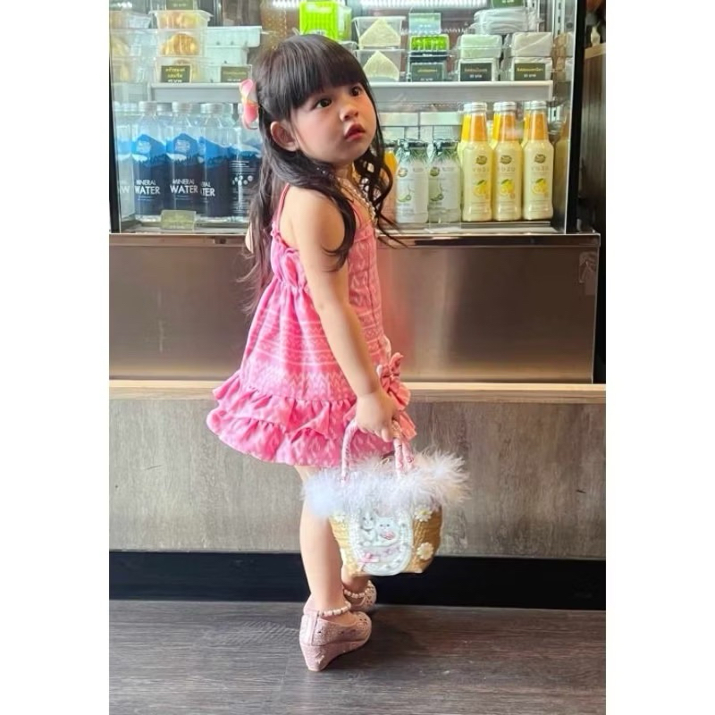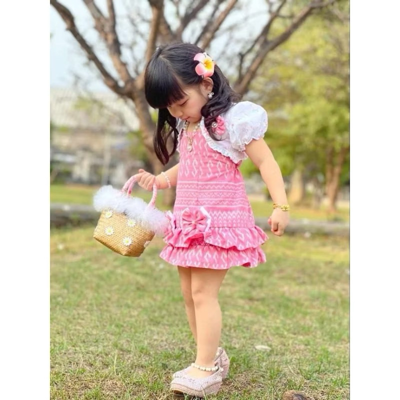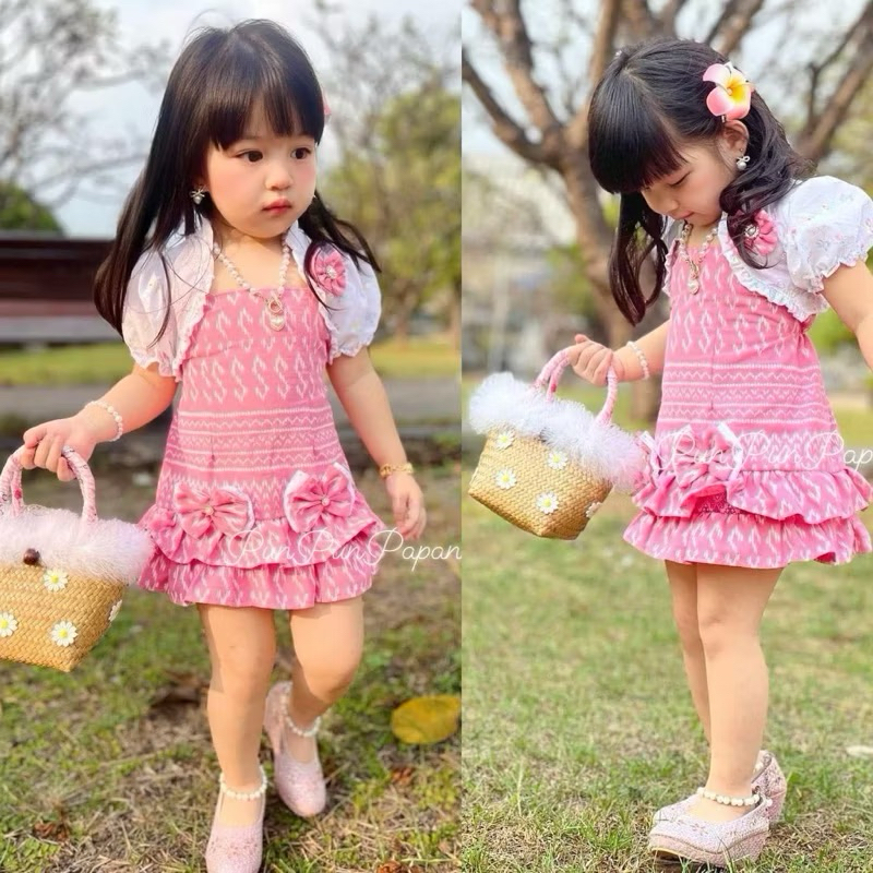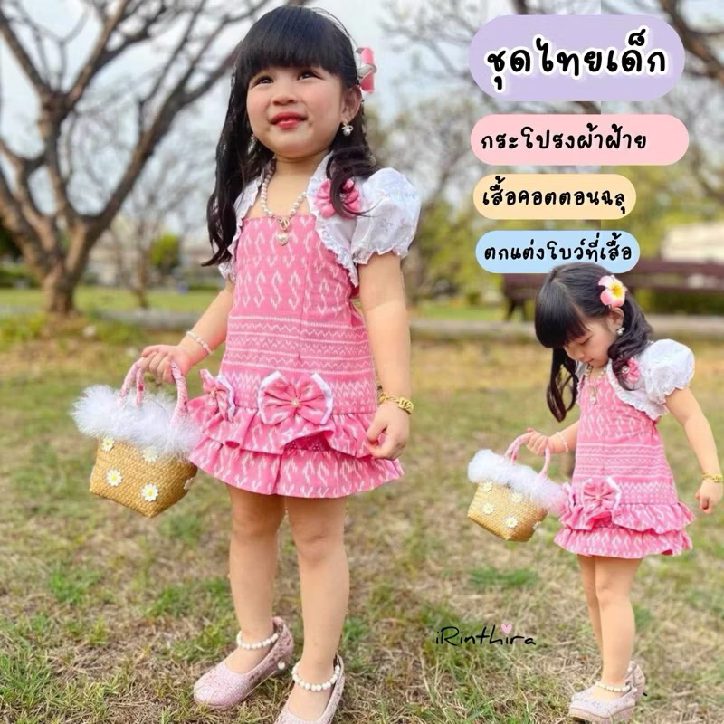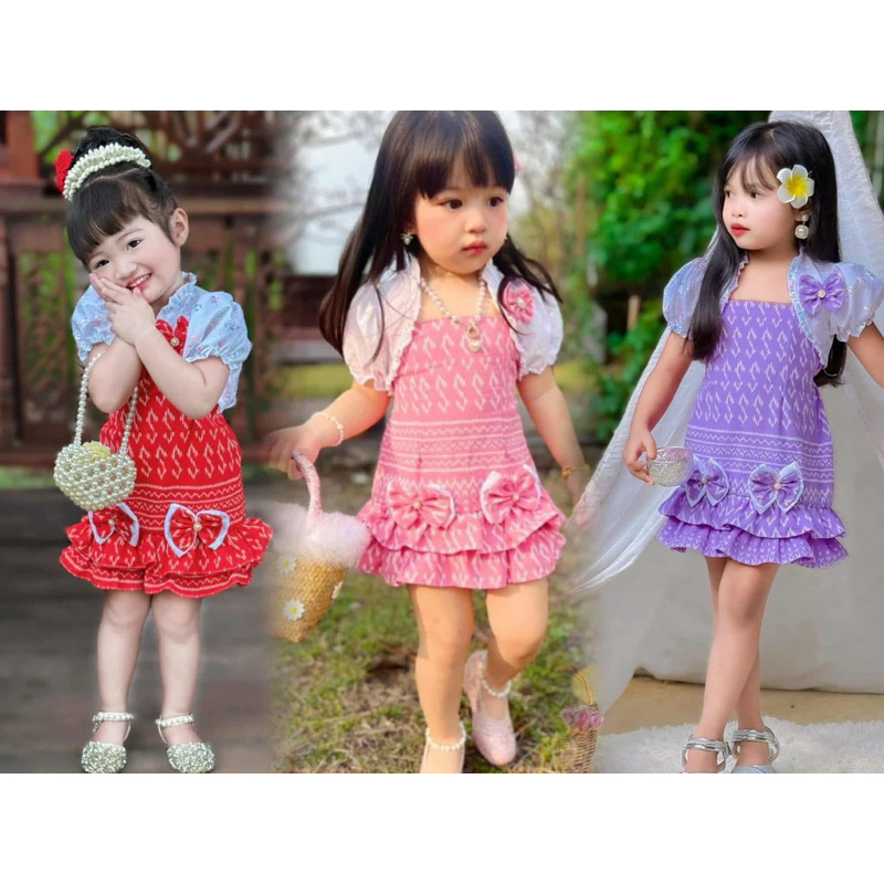 ชุดไทยเด็ก งานสวยละมุน เซ็ต2ชิ้น (กระโปรงสายเดี่ยว+เสื้อคลุม) ติดโบว์ที่เสื้อ