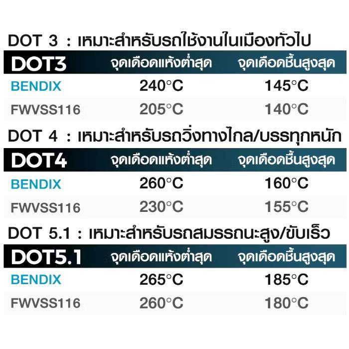 DOT 3 เหมาะสำหรับรถยนต์ทั่วไป น้ำมันเบรกสังเคราะห์เบ็นดิกซ์ให้จุดเดือดแห้งต่ำสุดถึง 240 องศาเซลเซียสและให้จุดเดือดเปียกถึง 145 องศาเซลเซียส