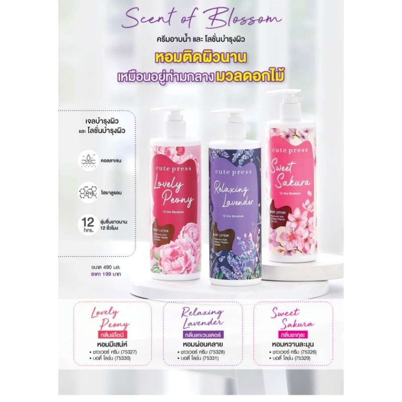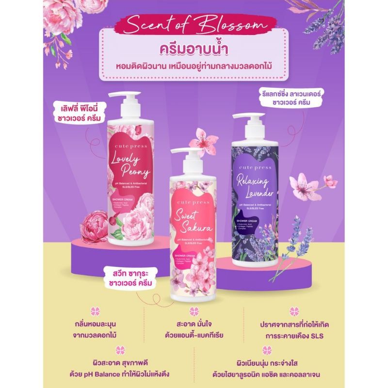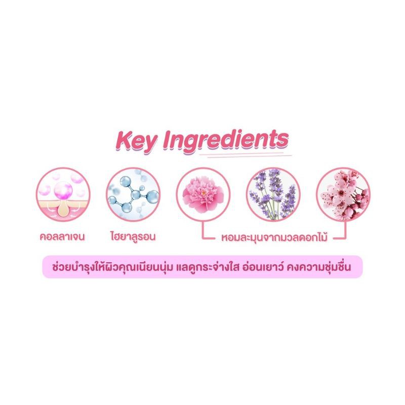 ครีมอาบน้ำ หอมๆด้วยสูตร pH Balance ช่วยคงความสมดุลให้ผิวชุ่มชื่น ไม่แห้งตึง พร้อมทั้งยังมีคุณสมบัติ Antibacterial อาบสนุก รู้สึกสะอาดได้อย่างมั่นใจ ทั้งมีคอลลาเจน เปปไทด์ คอมเพล็กซ์ ที่ช่วยให้ผิวใส เนียนนุ่ม ชุ่มชื่น ช่วยกระชับผิวให้เต่งตึง และมีไฮยาลูรอนิค แอซิด มอบความชุ่มชื่นให้ผิว และคงความชุ่มชื่นยาวนาน และสารสกัดจากดอกซากุระ, ดอกพีโอนี และดอกลาเวนเดอร์ ทั้งมอบความหอมกลิ่นติดผิว หอมฟุ้งทั่วห้องน้ำ และยังช่วยบำรุงให้ผิวคุณเนียนนุ่ม แลดูกระจ่างใส อ่อนเยาว์