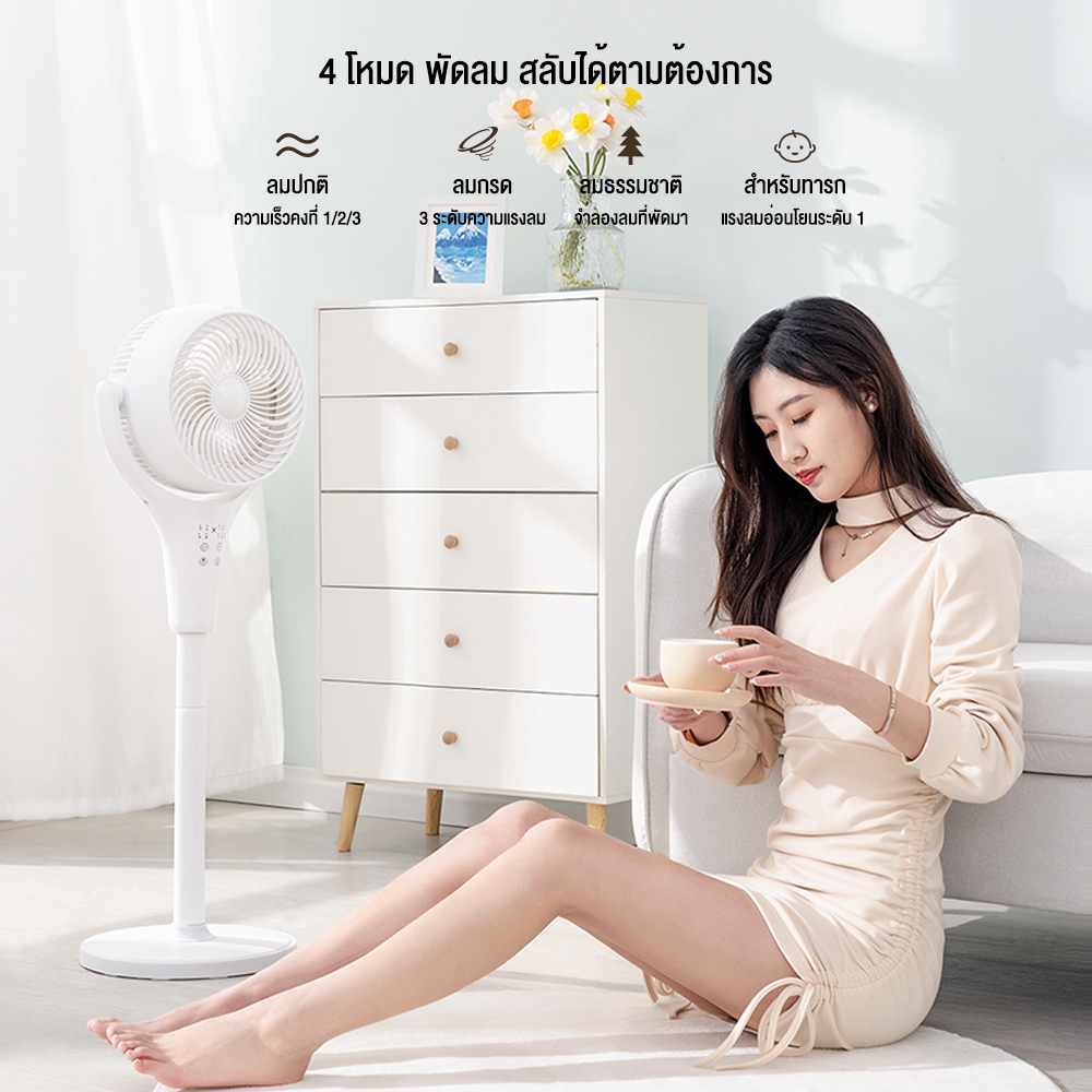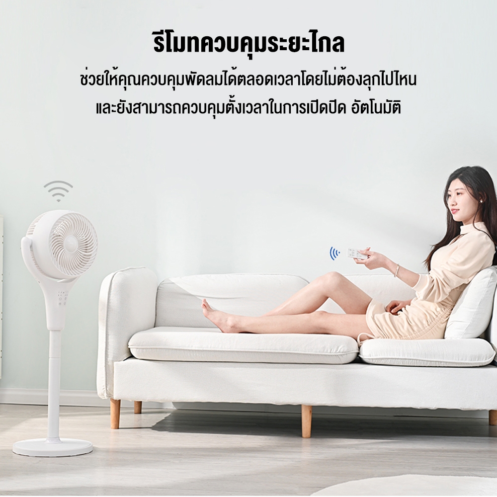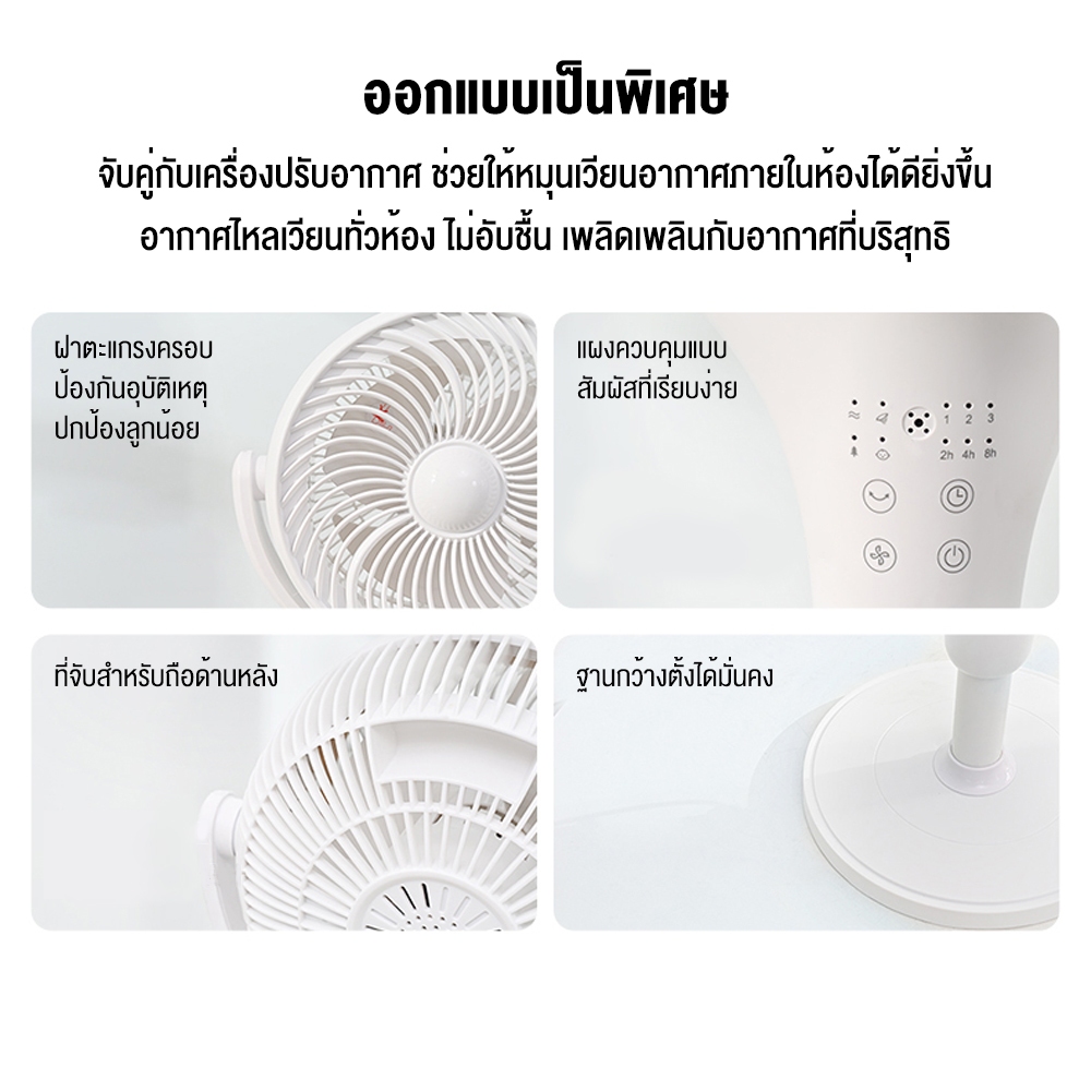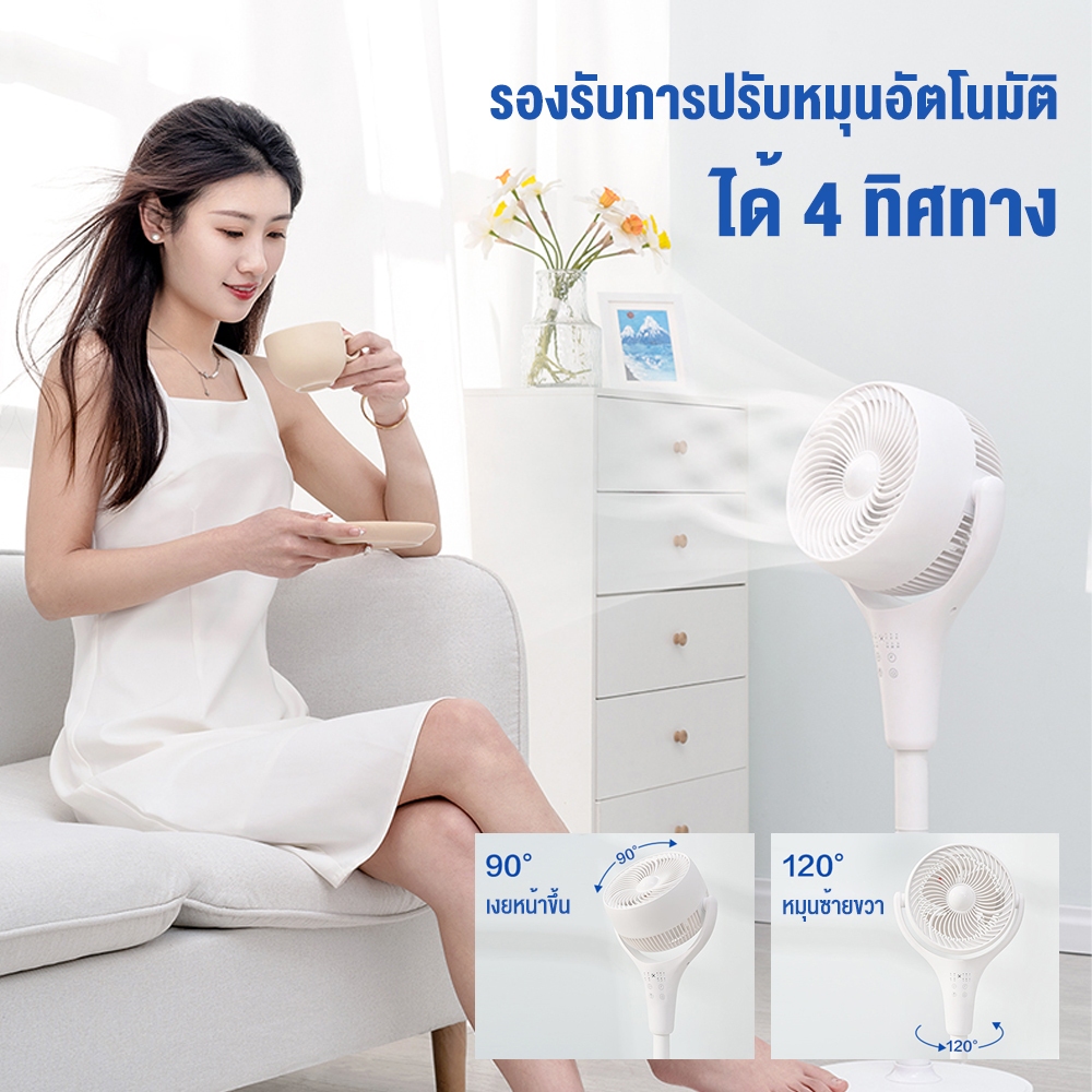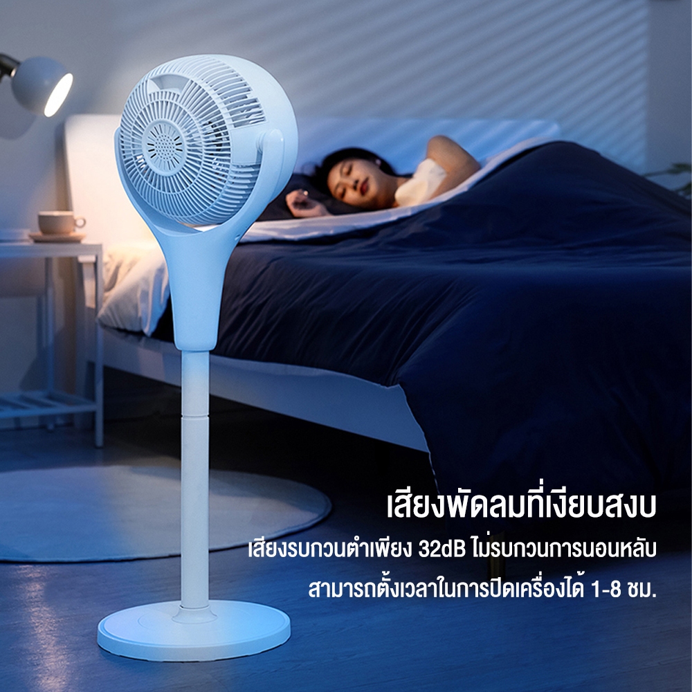 พัดลมหมุนเวียนอากาศ ปรับแรงลมได้ 3 ระดับ มาพร้อม 4 โหมดการทำงาน ปรับหมุนได้ 4 ทิศทาง ซ้าย/ขวา 120 องศา เงยขึ้นด้านบนได้ 90 องศา และ เพิ่มข้อต่อความสูงได้ ให้คุณสดชื่นไปกับสายลมที่หมุนเวียนทั่วทั้งห้อง ลมเย็นสบายทุกฤดูกาล เสียงการหมุนที่เงียบสงบเพียง 32dB ไม่รบกวนการนอนหลับ สามารถตั้งเวลาเปิด/ปิด อัตโนมัติได้ 1-8 ชม. มาพร้อมรีโมทควบคุมระยะไกล สะดวกสบาย ไม่ต้องลุกเดิน