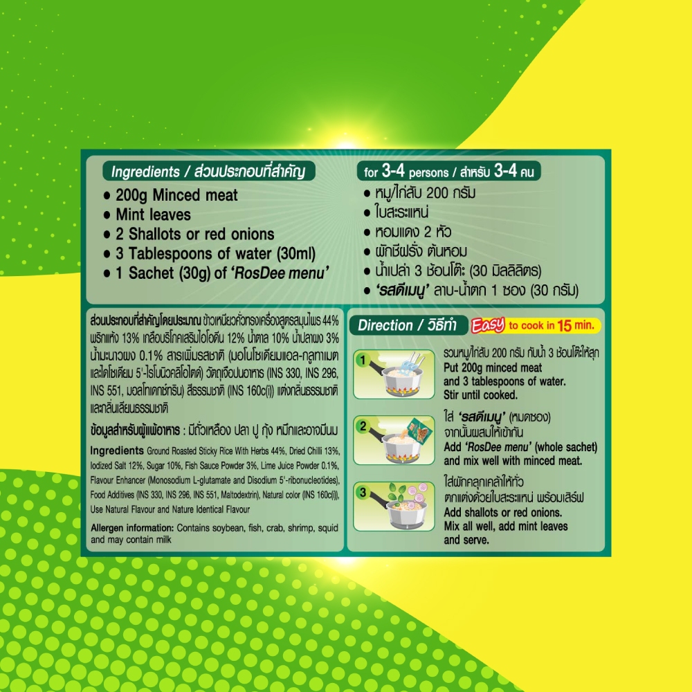 รสดีเมนู ลาบ-น้ำตก สูตรมะนาว คัดสรรวัตถุดิบคุณภาพทั้ง “มะนาวสกัดแท้” และ “ข้าวเหนียวคั่วสมุนไพร” ที่ให้กลิ่นหอมและรสเปรี้ยวอย่างเป็นธรรมชาติ ให้คุณเพลิดเพลินกับรสชาติของลาบที่ หอม อร่อย ลงตัว ครบจบในซองเดียว ไม่ต้องปรุงเพิ่ม พร้อมเสิร์ฟเมนูสุดอร่อยในพริบตา