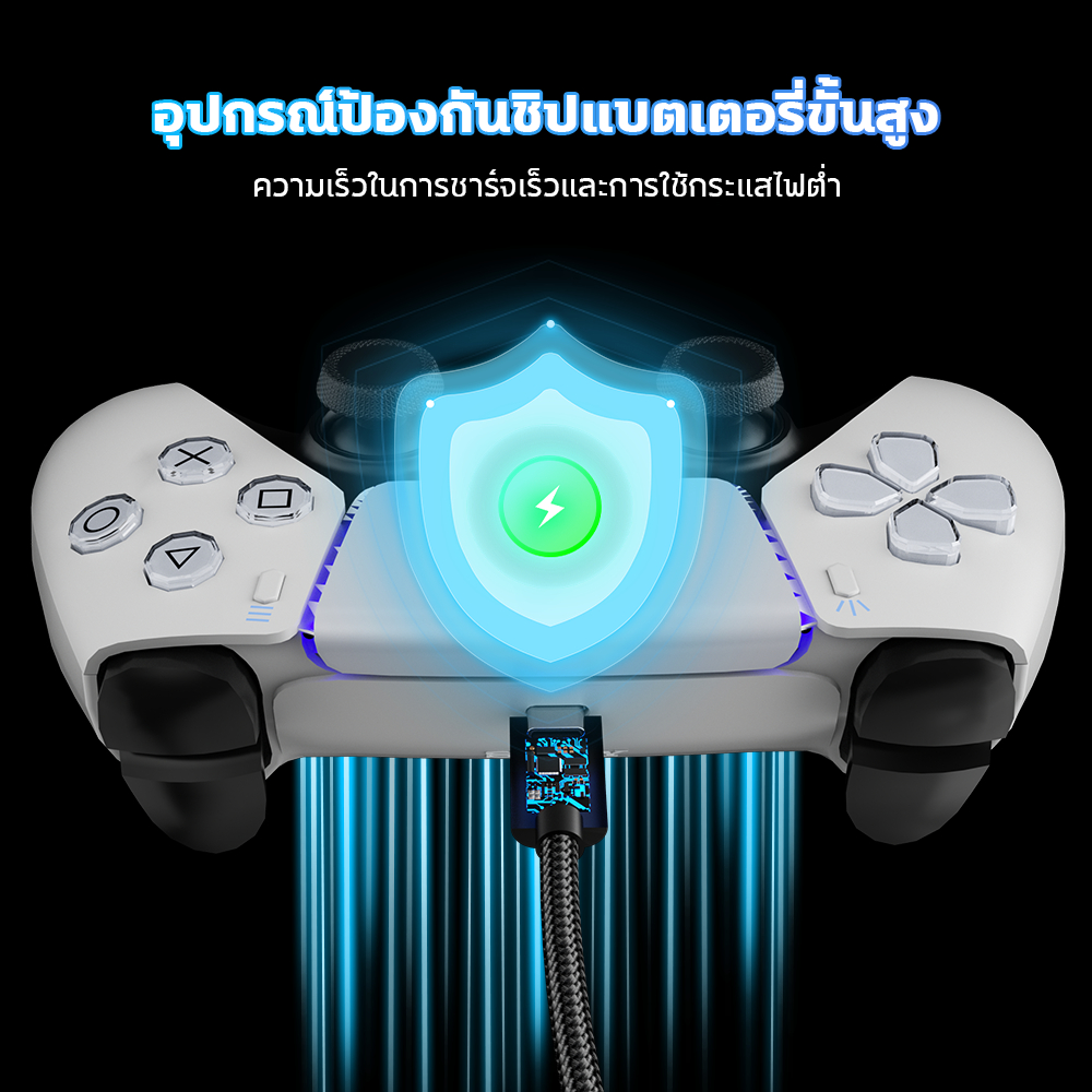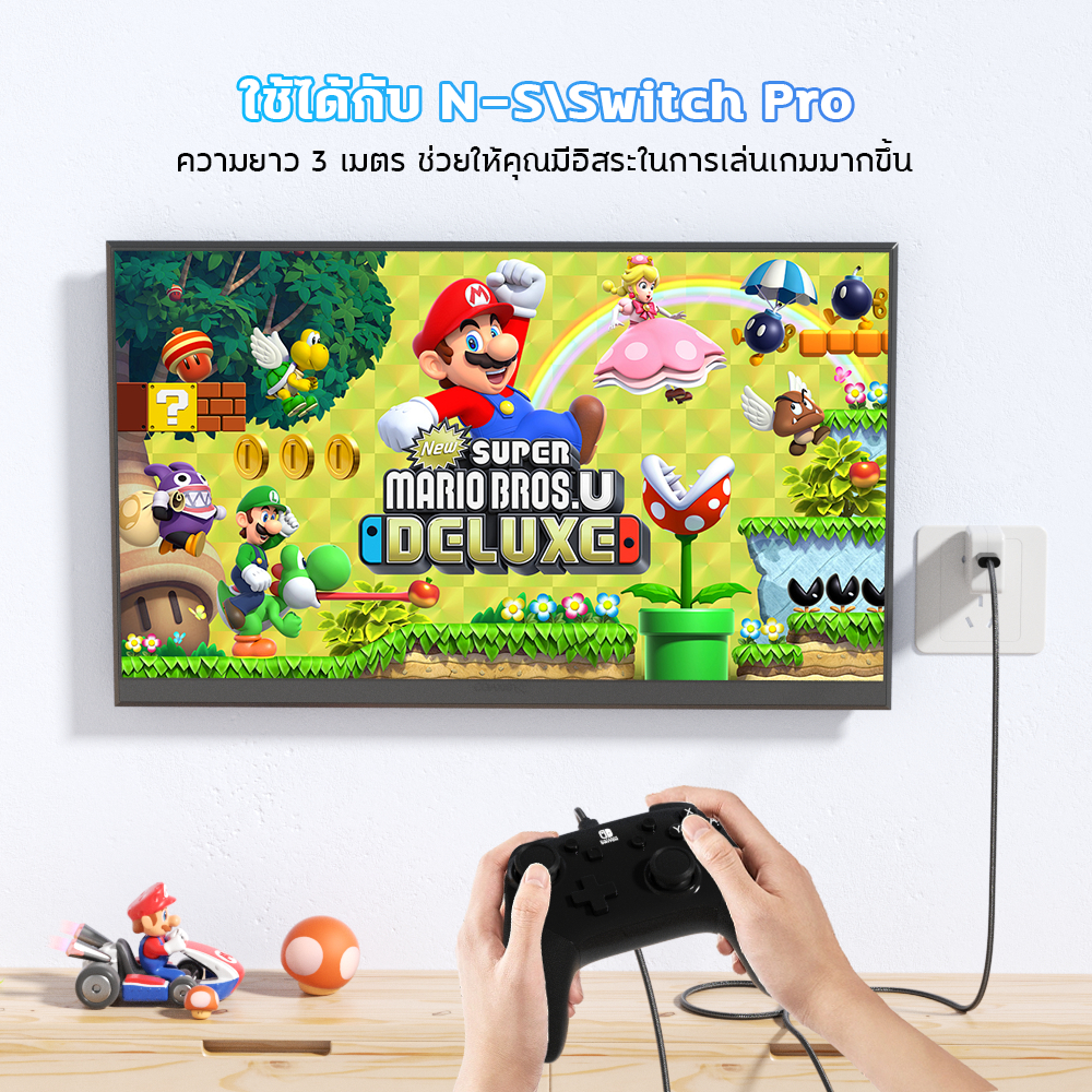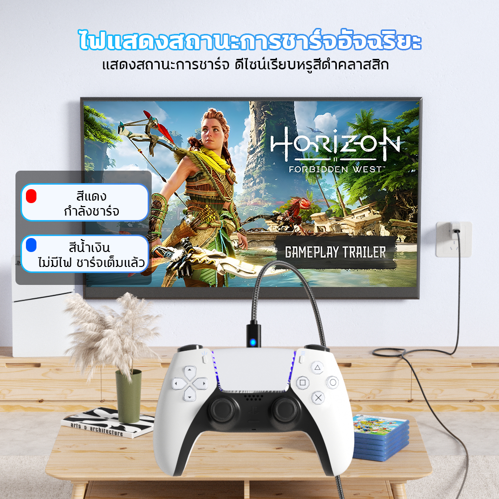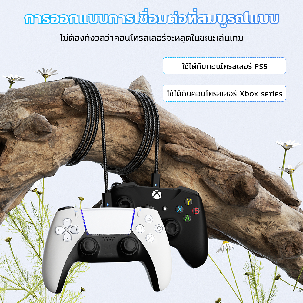 สายต่อยาว 3 เมตร ซึ่งหมายความว่าคุณสามารถเล่นเกมขณะนั่งบนโซฟาหรือบนเตียง และคุณสามารถชาร์จคอนโทรลเลอร์ที่อีกด้านหนึ่งของห้องได้โดยไม่รบกวนเกมของคุณ ไม่จำเป็นต้องหยุดชาร์จ ช่วยให้คุณเล่นเกมได้อย่างง่ายดาย