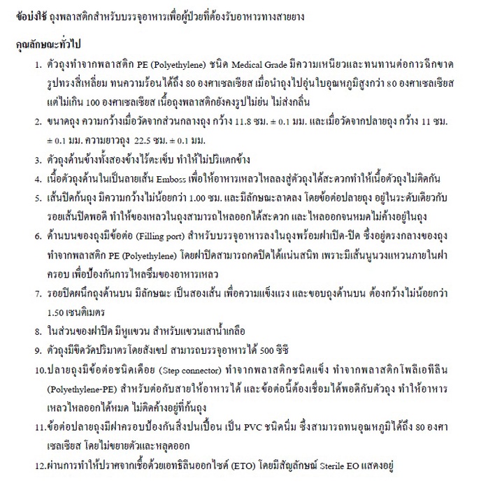 สายส่ง มีความยืดหยุ่น ไม่พับงอ มีความใส สามารถมองเห็นอาหารได้อย่างชัดเจน มีความยาวตลอดทั้งชุดไม่น้อยกว่า 100 ซม.
