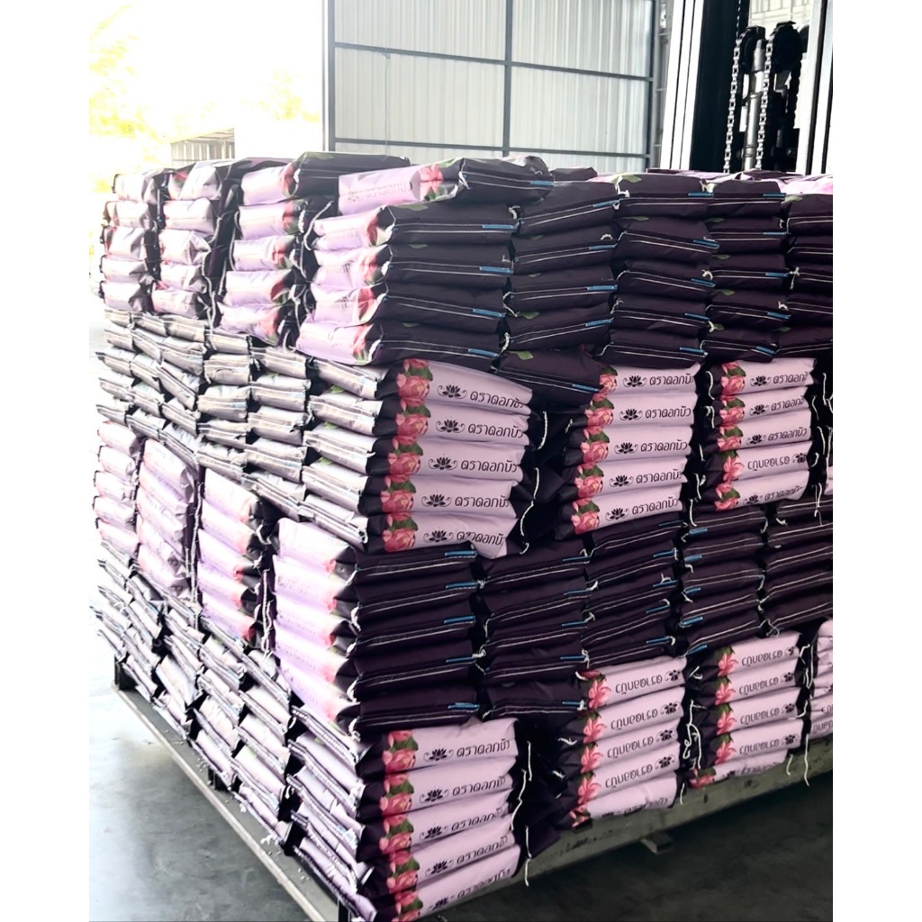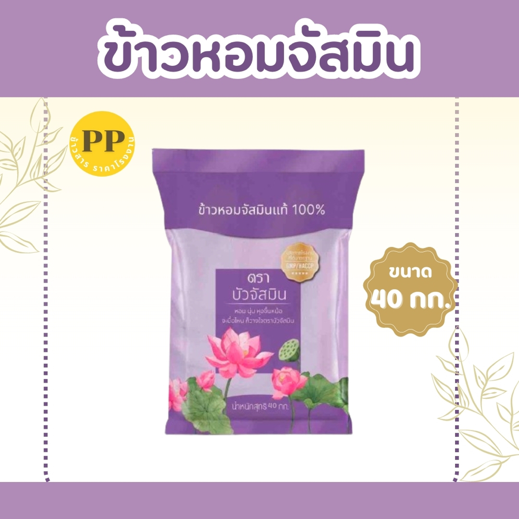 ข้าวหอมสายพันธุ์จัสมิน ตราบัวจัสมิน ถุงสีม่วง ข้าวนาปรัง อายุ 7-8 เดือน ขนาดบรรจุ 40 กิโลกรัม 1 ถุง
