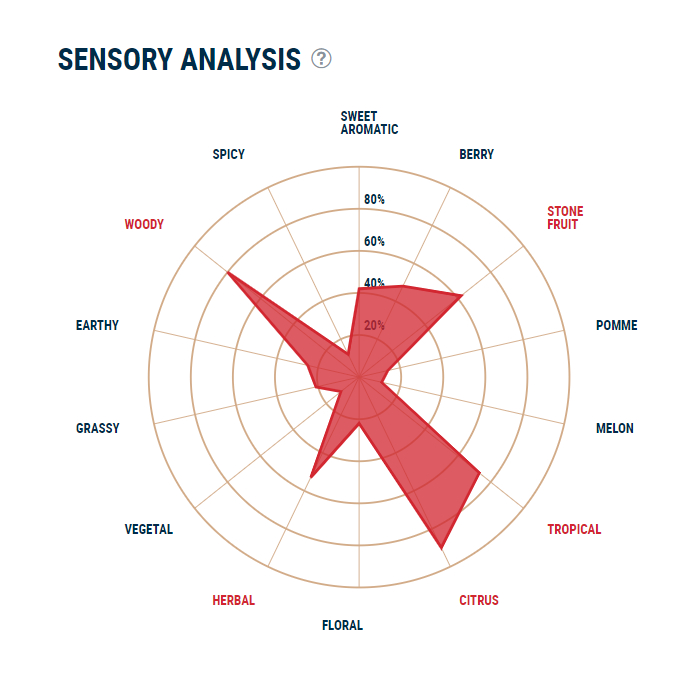 Nelson Sauvin™ (NZ) มีองค์ประกอบที่เด่นชัดขององุ่น Sauvignon Blanc และ มะเฟืองคั้น, Key lime, pine needles, earthy dill, และ ผลไม้เมืองร้อนจำพวก ลิ้นจี่ มะละกอ และเสาวรส