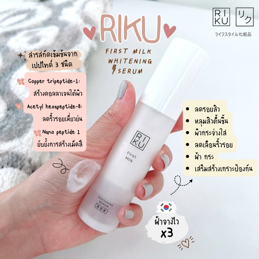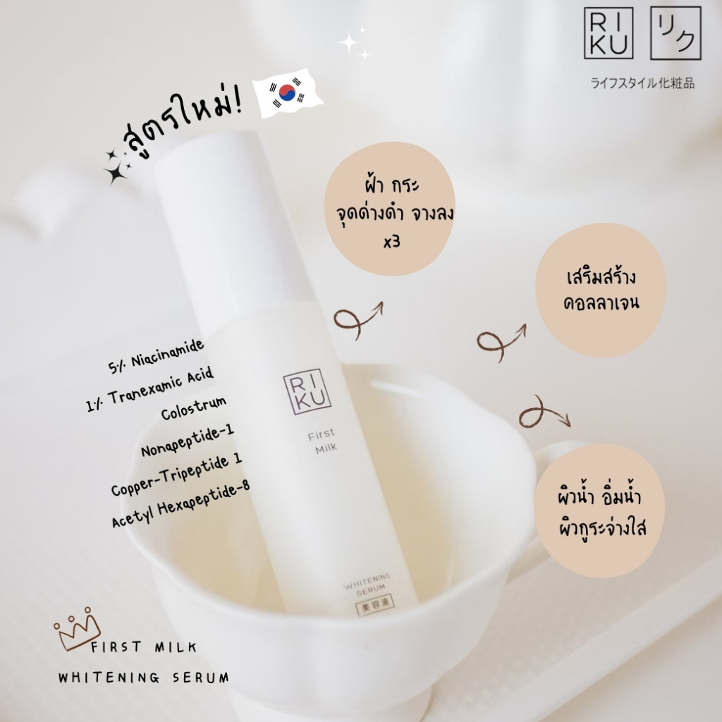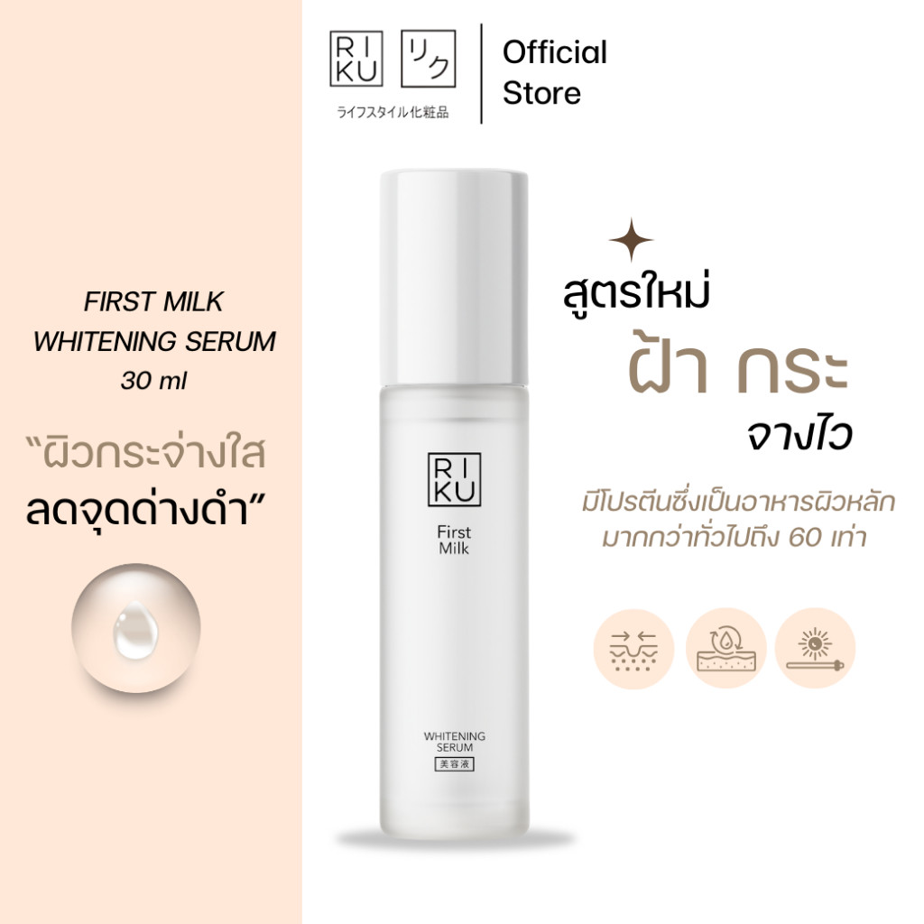 RIKU First Milk Whitening Serum ไวท์เทนนิ่งเซรั่ม สูตรน้ำนมแรกเข้มข้น (Colostrum) พร้อมสารบำรุงนานาชนิดตรงเข้าบำรุงผิวให้กระจ่างใส ปลอดภัย ทำให้ผิวแลดูสุขภาพดี ด้วยคุณค่าของสารบำรุงด้วยสารสกัดที่เข้มข้นจากเปปไทด์ 3 ชนิด ได้แก่