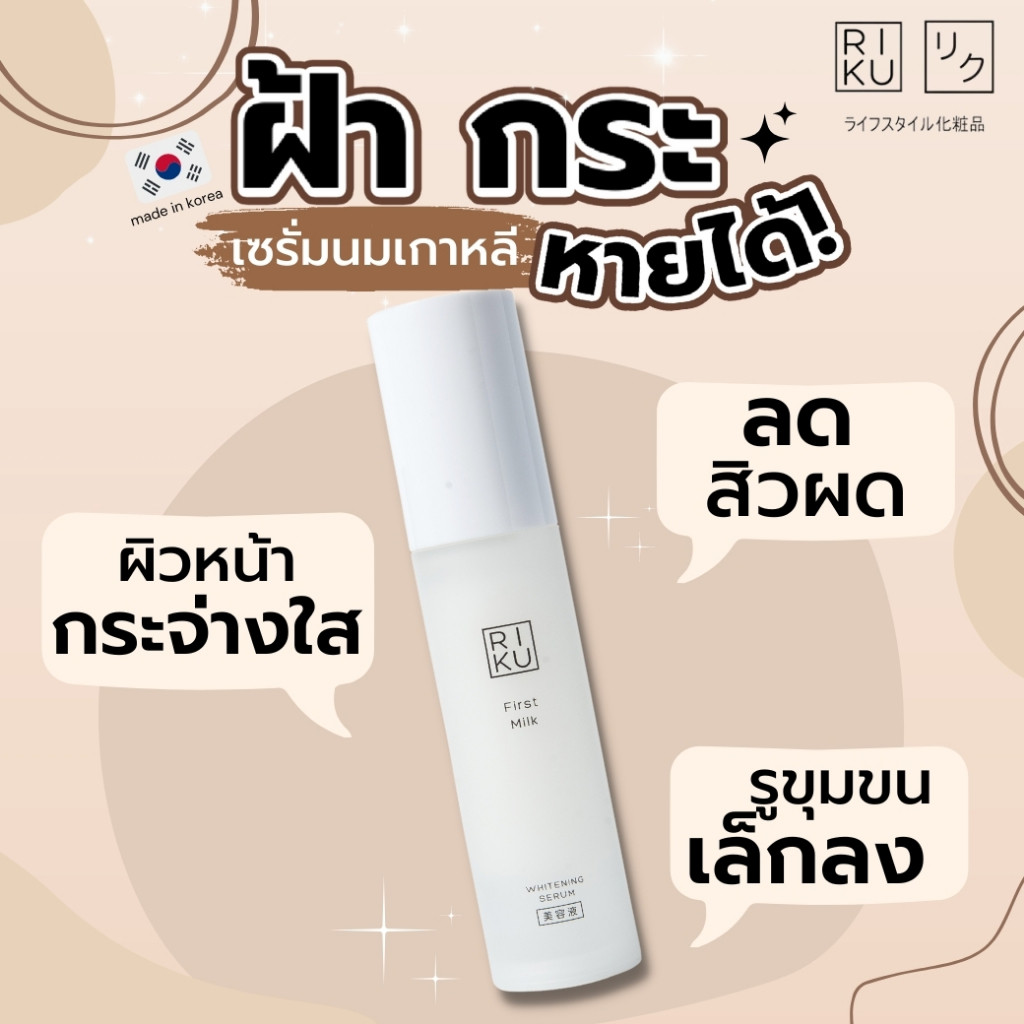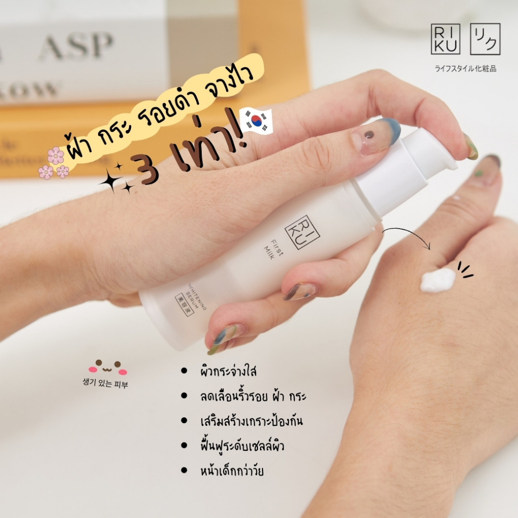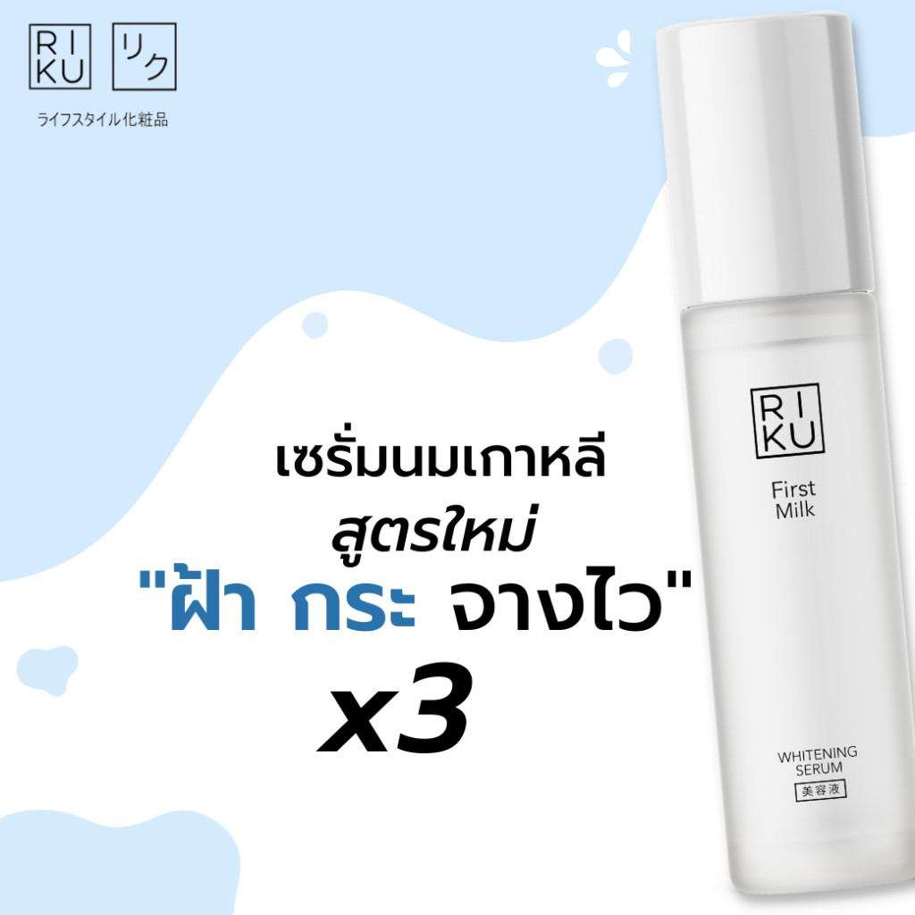 RIKU First Milk Whitening Serum ไวท์เทนนิ่งเซรั่ม สูตรน้ำนมแรกเข้มข้น (Colostrum) พร้อมสารบำรุงนานาชนิดตรงเข้าบำรุงผิวให้กระจ่างใส ปลอดภัย ทำให้ผิวแลดูสุขภาพดี ด้วยคุณค่าของสารบำรุงด้วยสารสกัดที่เข้มข้นจากเปปไทด์ 3 ชนิด ได้แก่