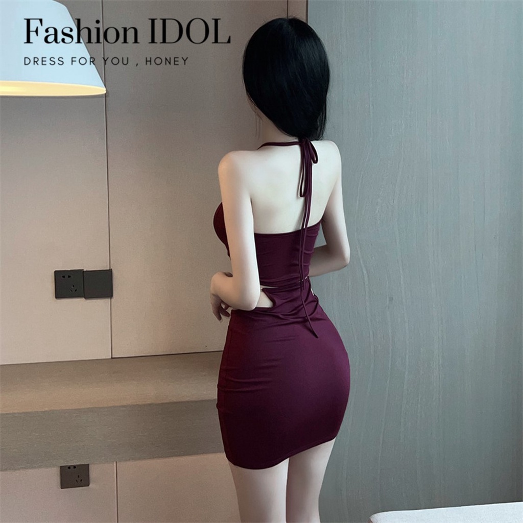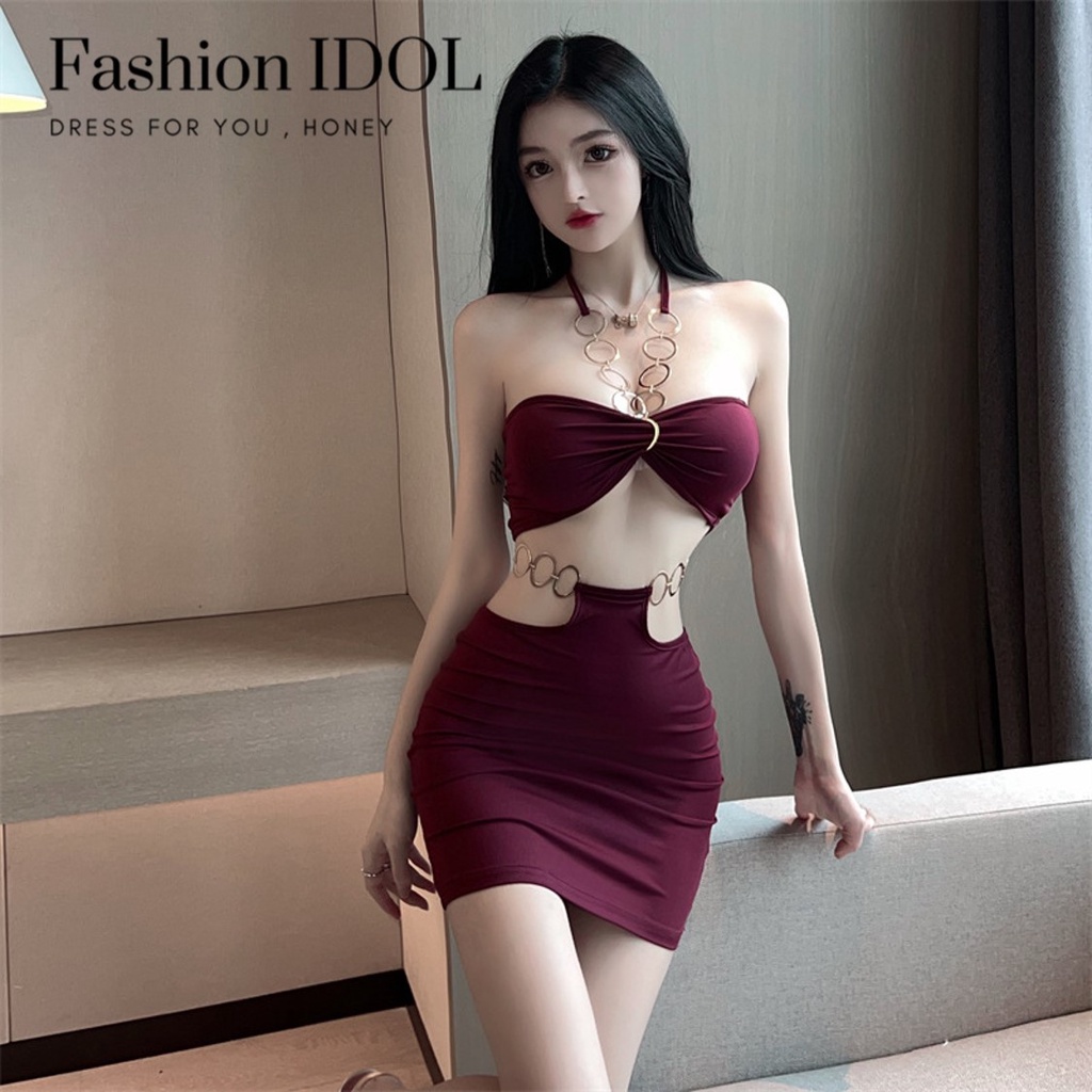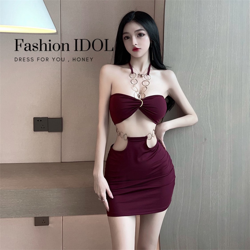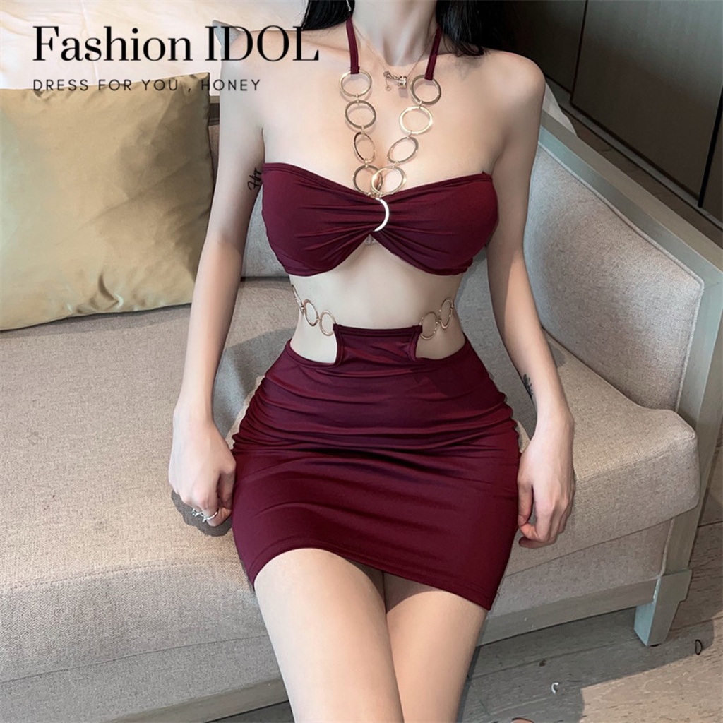 เซ็ททูพีชสีแดงเข้ม เสื้อครอปคล้องคอโชว์หน้าท้อง + กระโปรงสั้นเอวเว้า แต่งแหวนโลหะสตรีทคลับ