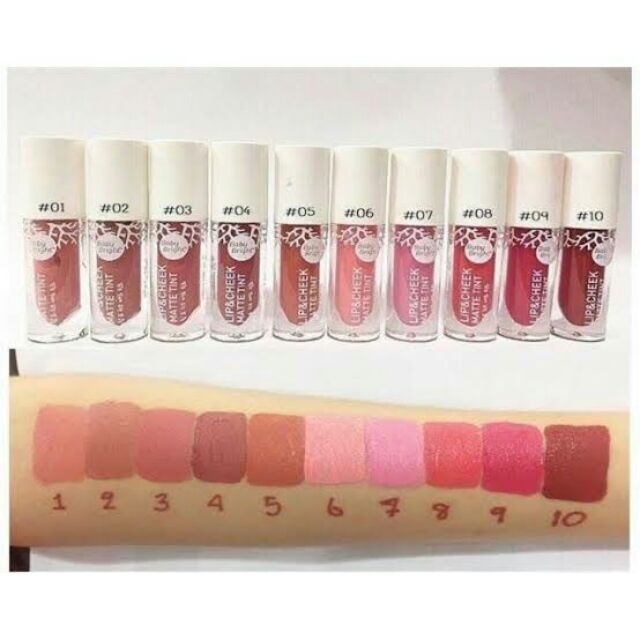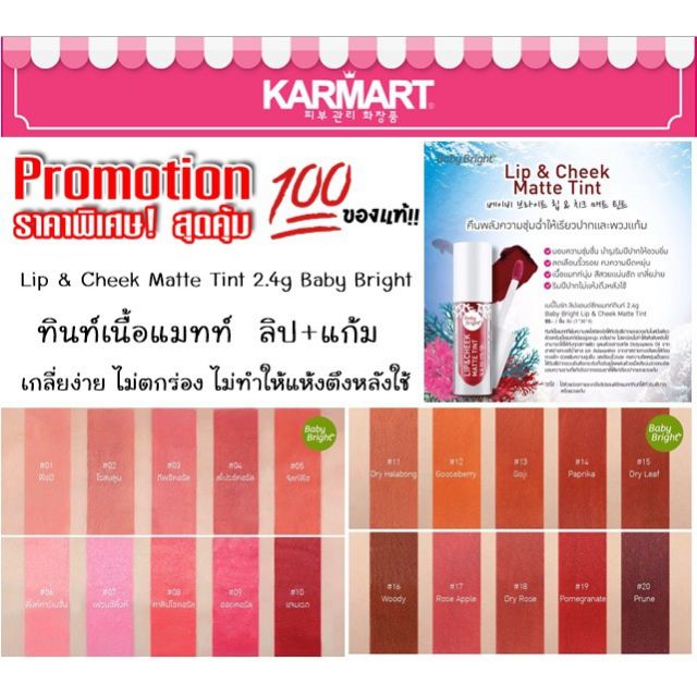 #ลิปเบบี้ไบร์ท ลิปที่ทาได้ทั้งปากและแก้ม สีสวยและมี 20 สี ให้ได้เลือกกันตามใจชอบ มีโทนส้มอิฐชมพู และแดง #ตินท์เนื้อแมท ที่เพิ่มความสดใสจะจัดให้กับริมฝีปากและแก้มในหนึ่งเดียว เนื้อแมทเนียนนุ่มละมุนเกลี่ยง่ายไม่ตกร่องไม่ทำให้แห้งตึงหลังใช้ #เบบี้ไบร์แอนด์ชีค ซื้อเยอะมีของแถมจากทางร้านให้อีกด้วยนะคะ
