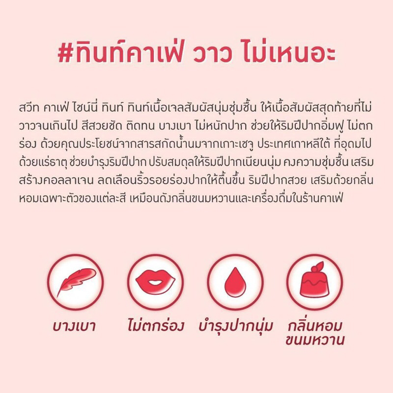 เติมเต็มริมฝีปากให้อวบอิ่มด้วย สวีท คาเฟ่ ไชน์นี่ ทินท์ ทินท์เนื้อเจล สัมผัสนุ่มชุ่มชื้น ให้เนื้อสัมผัสสุดท้ายที่ไม่วาวและไม่แมทท์จนเกินไป สีสวยชัด บางเบา ไม่หนักปาก ช่วยให้ริมฝีปากอิ่มฟู ไม่ตกร่อง ด้วยคุณประโยชน์จากสารสกัดน้ำนมจากเกาะเชจู ประเทศเกาหลีใต้ ที่อุดมไปด้วยแร่ธาตุ ช่วยบำรุงริมฝีปากได้อย่างตรงจุด ปรับสมดุลให้ริมฝีปากเนียนนุ่ม คงความชุ่มชื้น เสริมสร้างคอลลาเจน ลดเลือนริ้วรอยร่องปากให้ตื้นขึ้น พร้อมอวดริมฝีปากสวย เนียนนุ่ม อวบอิ่ม สดใสเปล่งปลั่ง เป็นธรรมชาติอย่างลงตัว