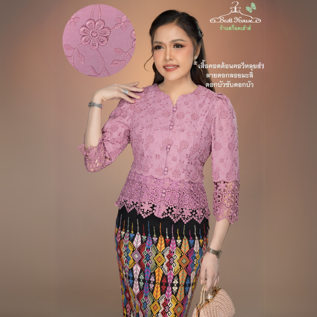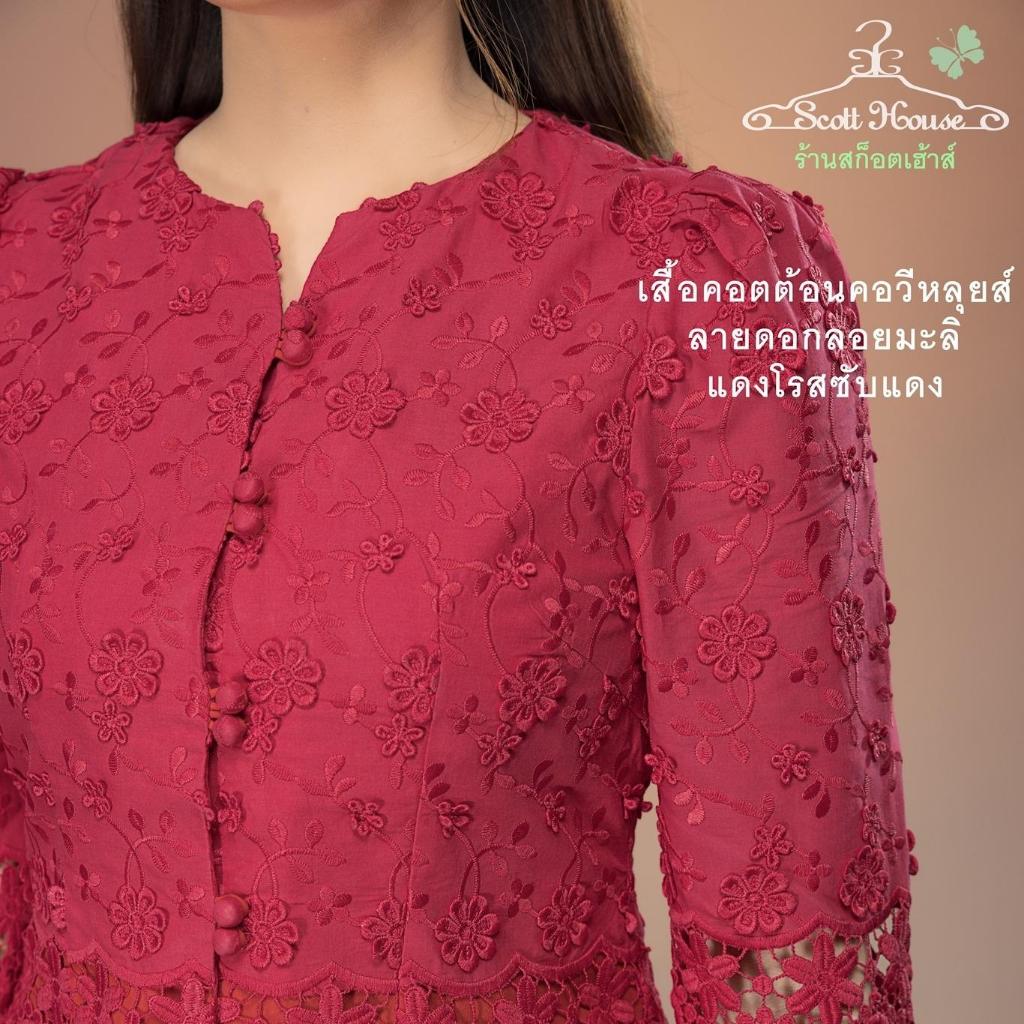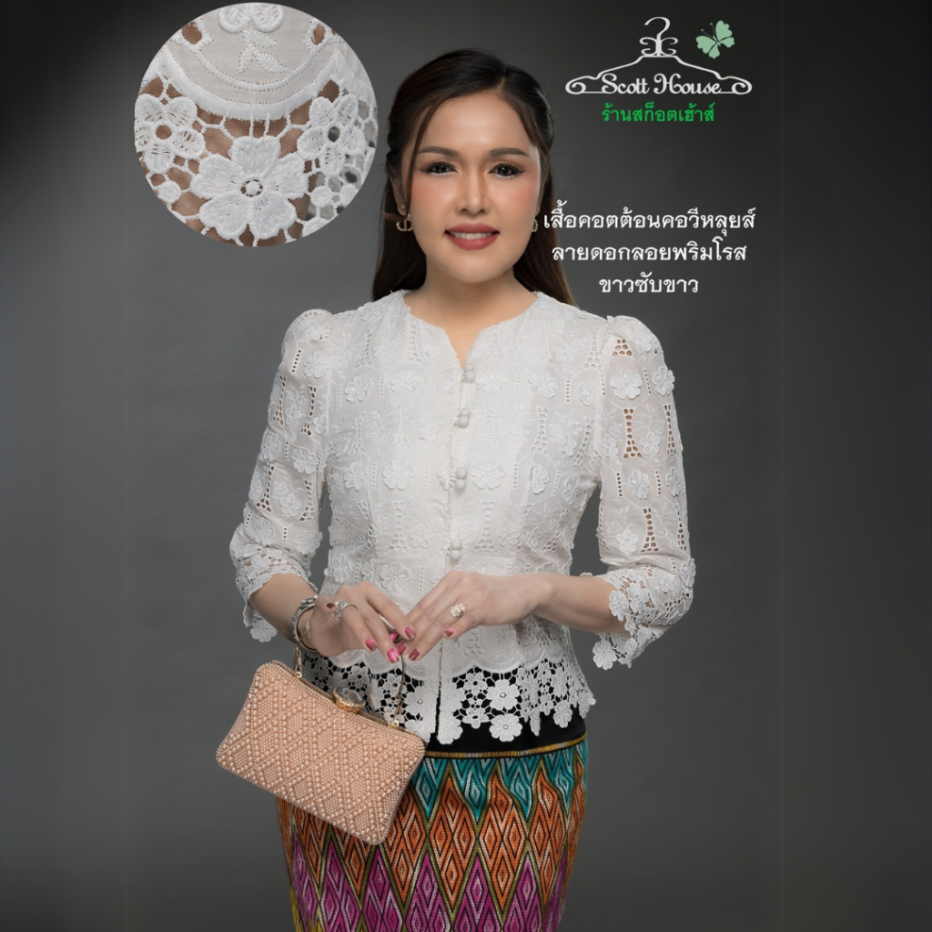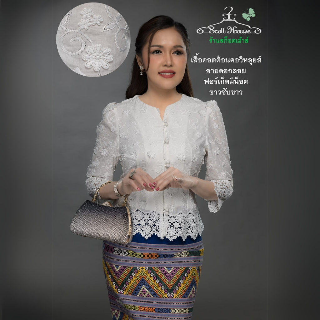 ” เสื้อคอตต้อน คอวีหลุยส์ ” ผ้าปักฉลุเพิ่มดอกลอย เกรดพรีเมียม