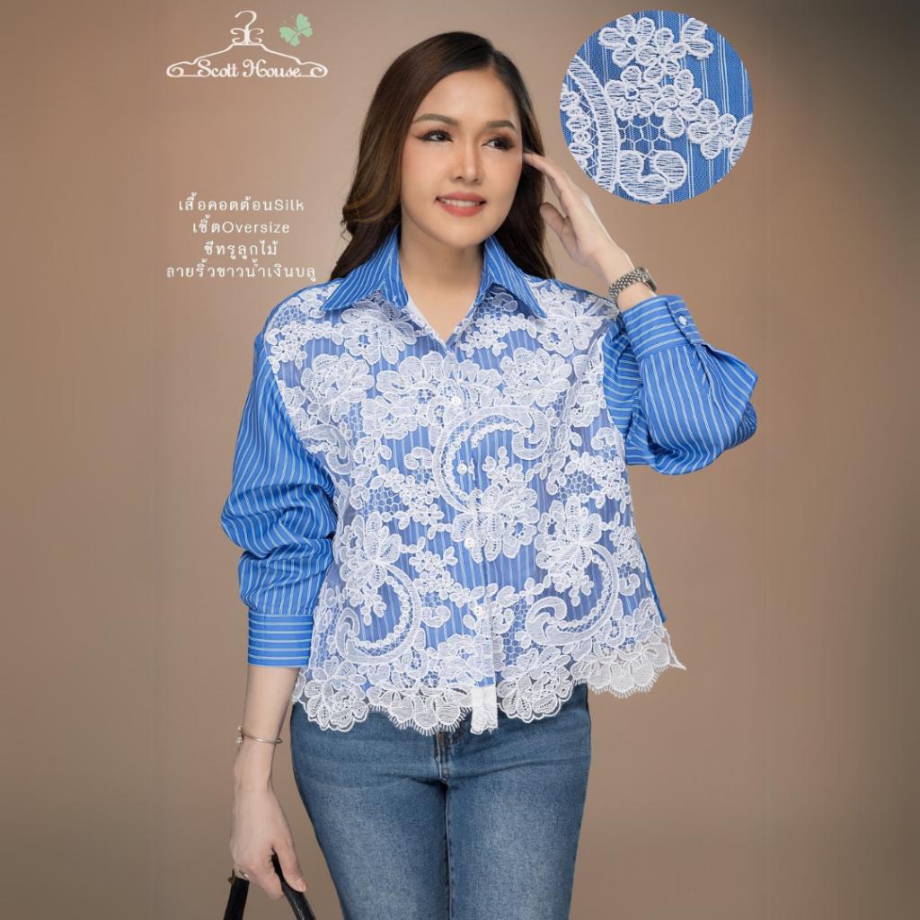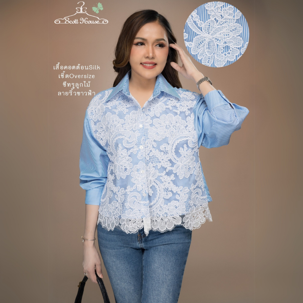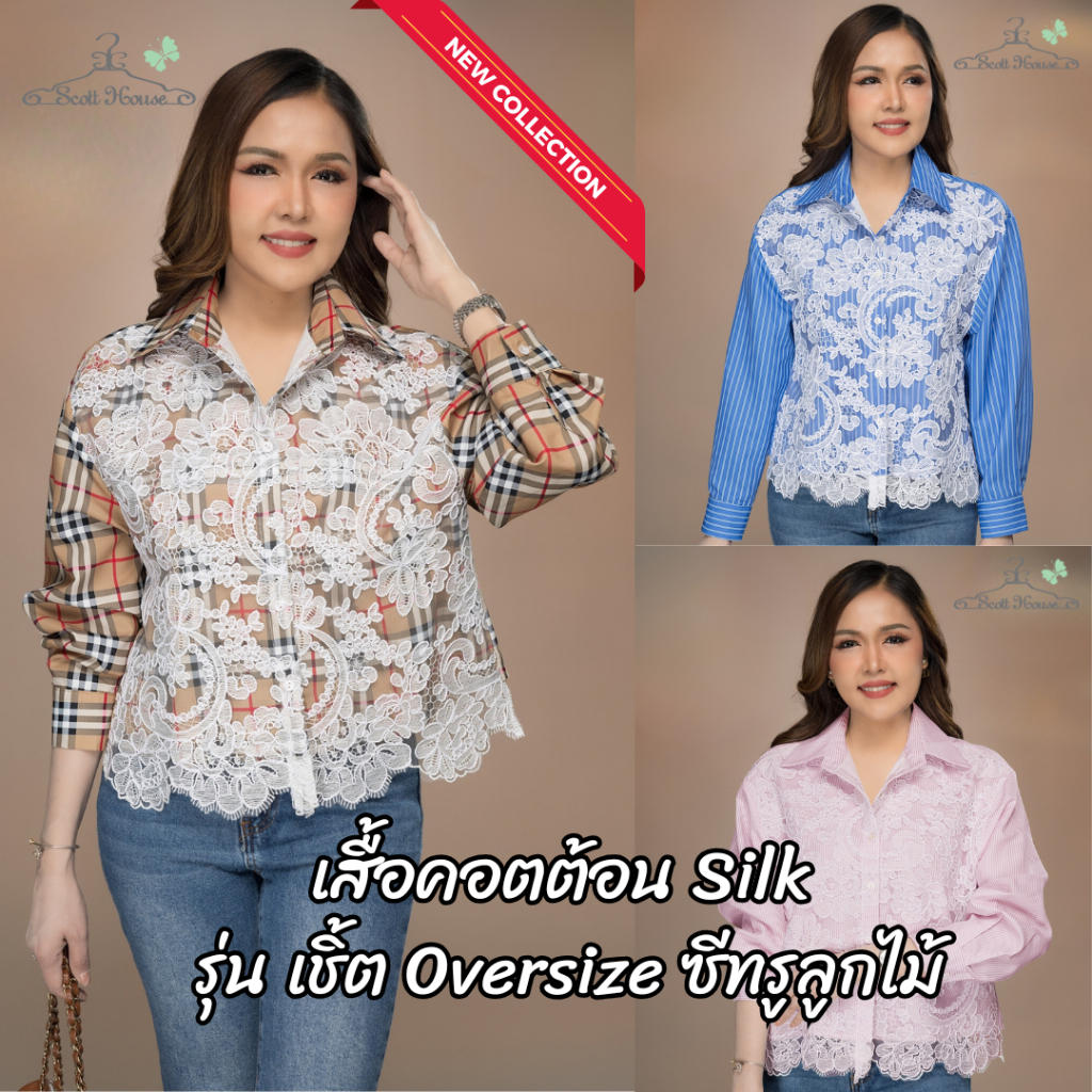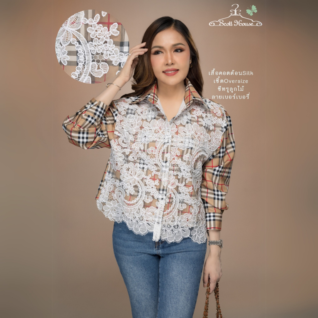 ” เสื้อคอตต้อน Silk เชิ้ต Oversize ซีทรูลูกไม้ ”