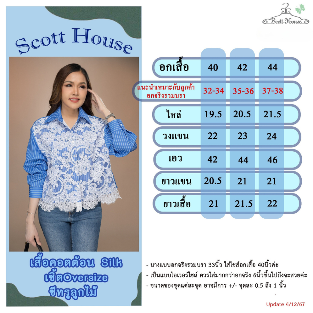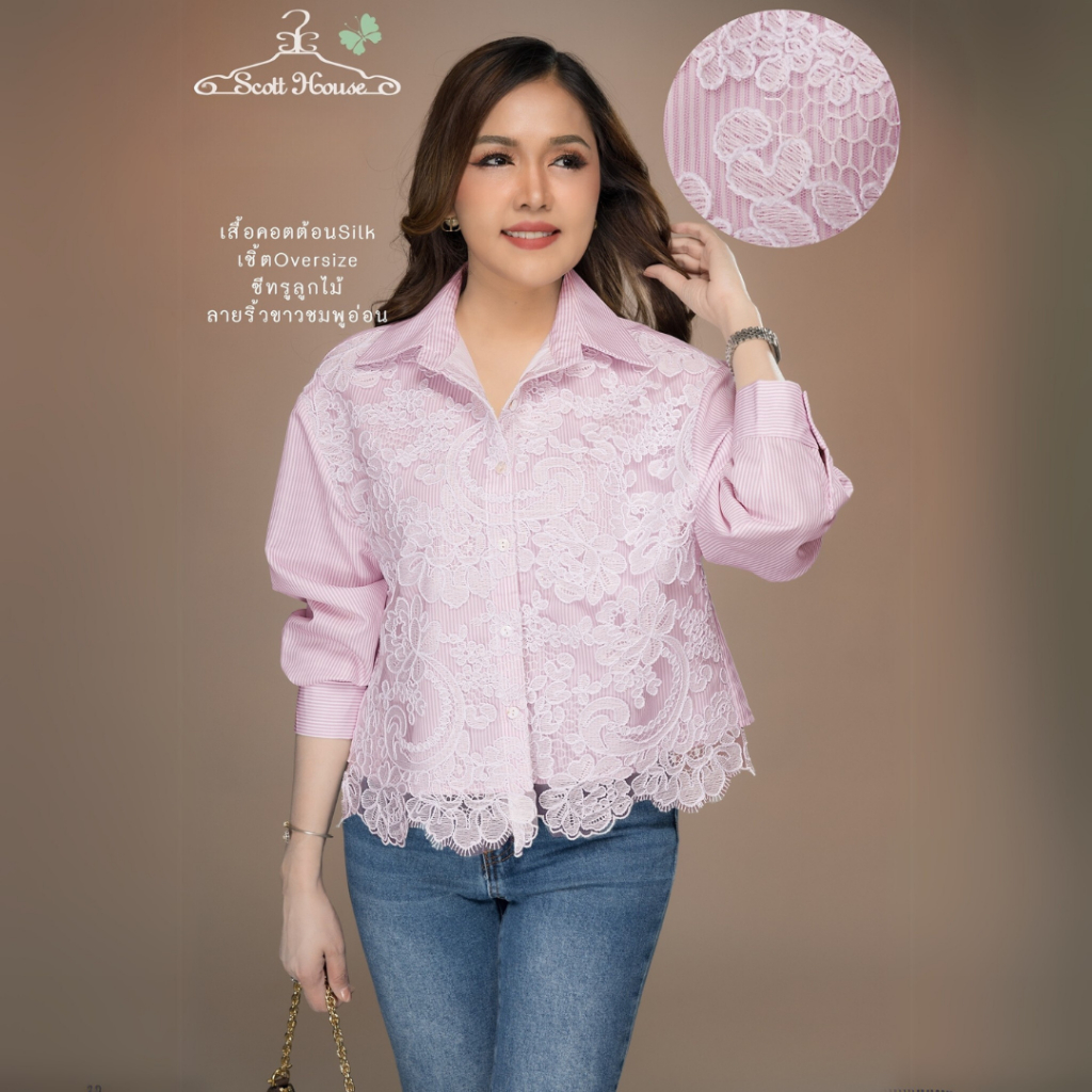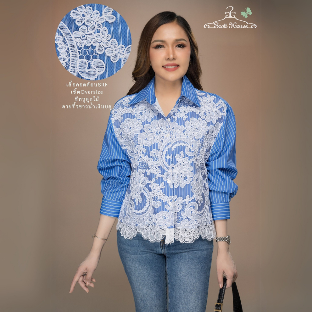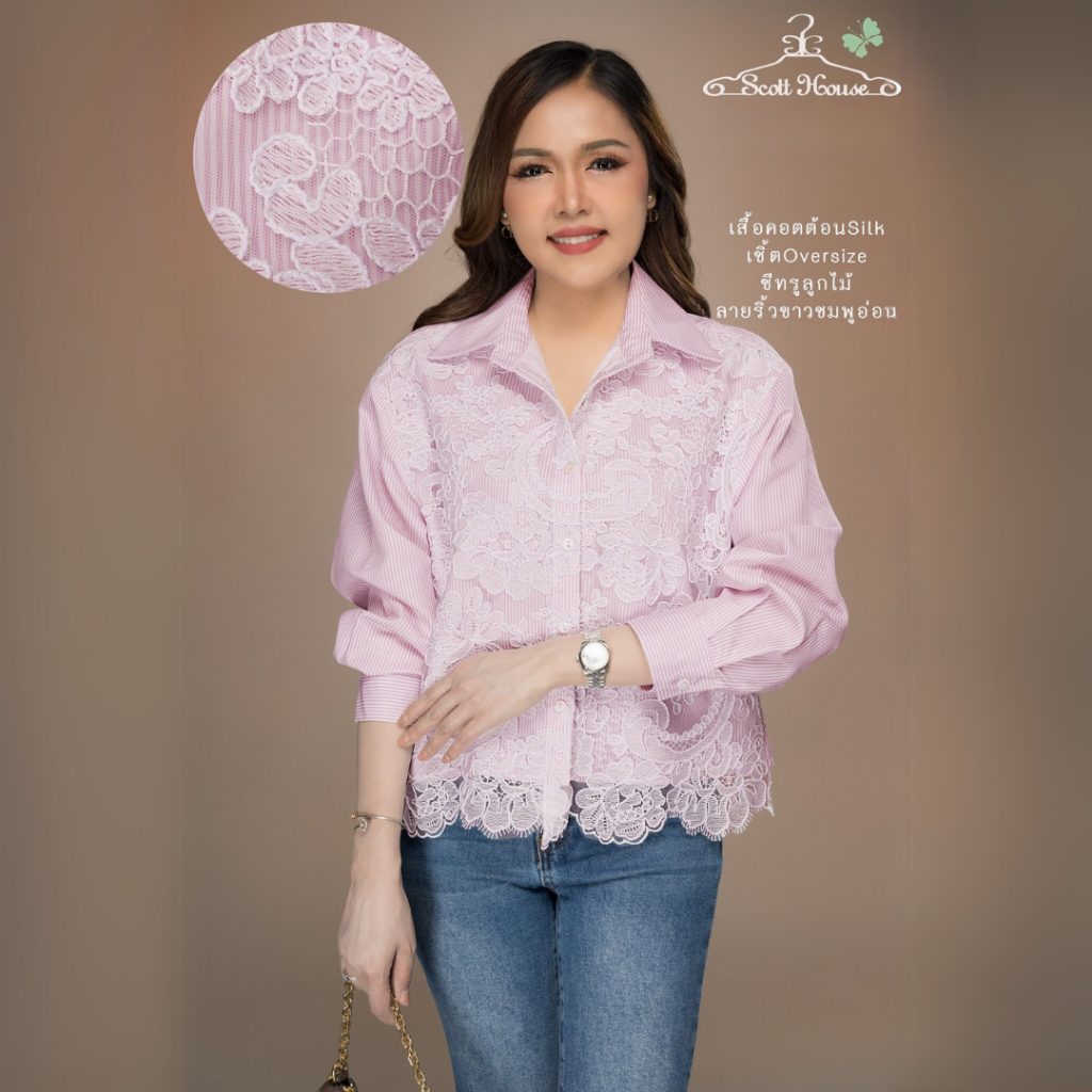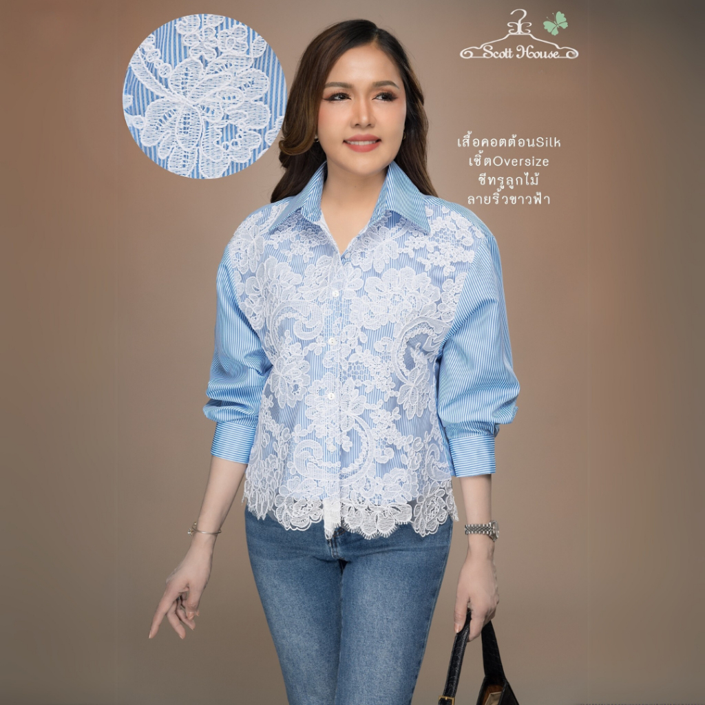 ” เสื้อคอตต้อน Silk เชิ้ต Oversize ซีทรูลูกไม้ ”