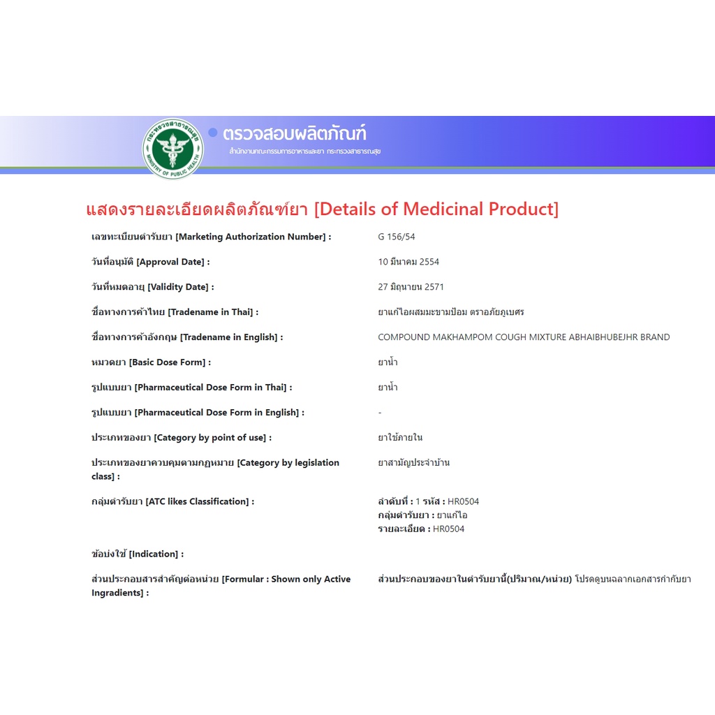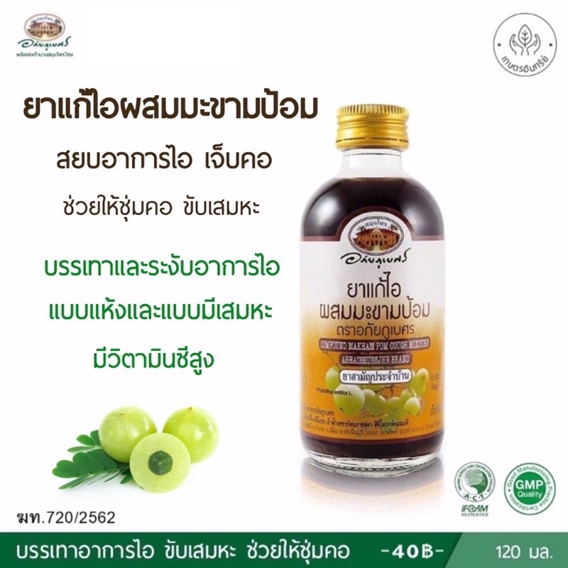 ส่วนประกอบ: ใน 100 มิลลิลิตร มีสารสกัดมะขามป้อมเข้มข้น 60 มิลลิลิตร สารสกัดมะแว้ง 5 มิลลิลิตร และตัวยาอื่นๆ