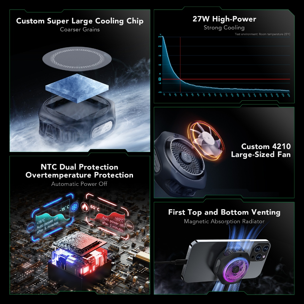 เทคโนโลยี semiconductor variable frequency cooling technology ที่อัปเกรดใหม่ทั้งหมด ลดอุณหภูมิลงต่ำกว่า 0 °Cา ภายใน 30 วินาที ให้การระบายความร้อนที่ทรงพลังยิ่งขึ้น พลังงานเต็มกำลัง 27W ผสานกับชิประบายความร้อน TEC ที่กำหนดเองเพื่อให้ลดอุณหภูมิลงได้สูงสุดถึง 40°C และเย็นลงได้ต่ำถึง -15°C บอกลาความร้อนสูงเกินไป หน้าจอดำ และเฟรมดรอป และเพลิดเพลินไปกับการเล่นเกมด้วยเฟรมเรตสูงตลอดเวลา
