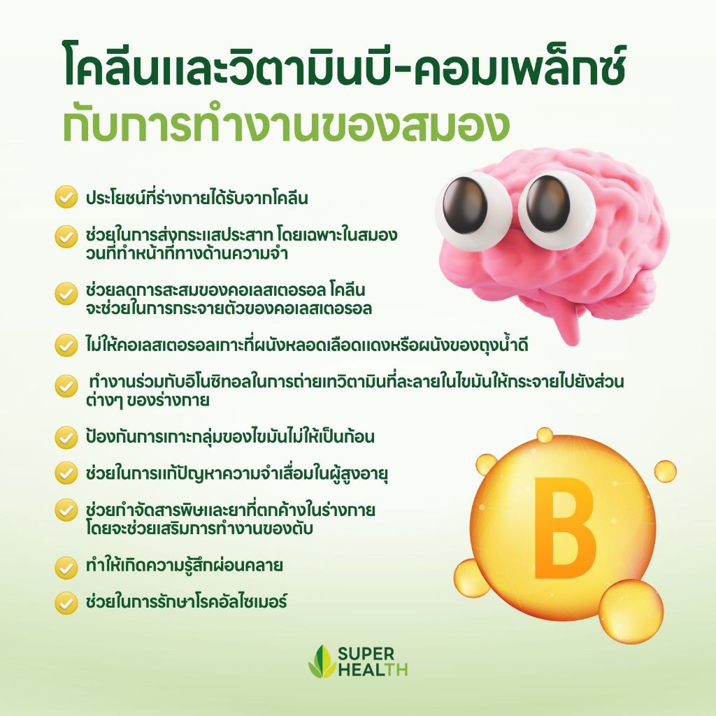 บำรุงสมองและระบบประสาท: โคลีนเป็นสารตั้งต้นในการสังเคราะห์อะเซททิลโคลีน ซึ่งเป็นสารสื่อประสาทที่สำคัญ ช่วยเสริมสร้างความจำและการเรียนรู้