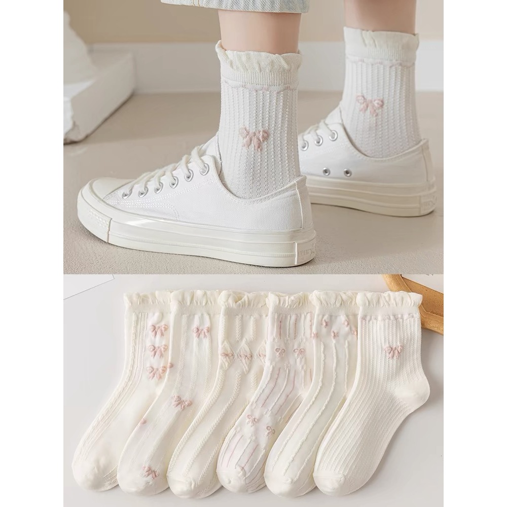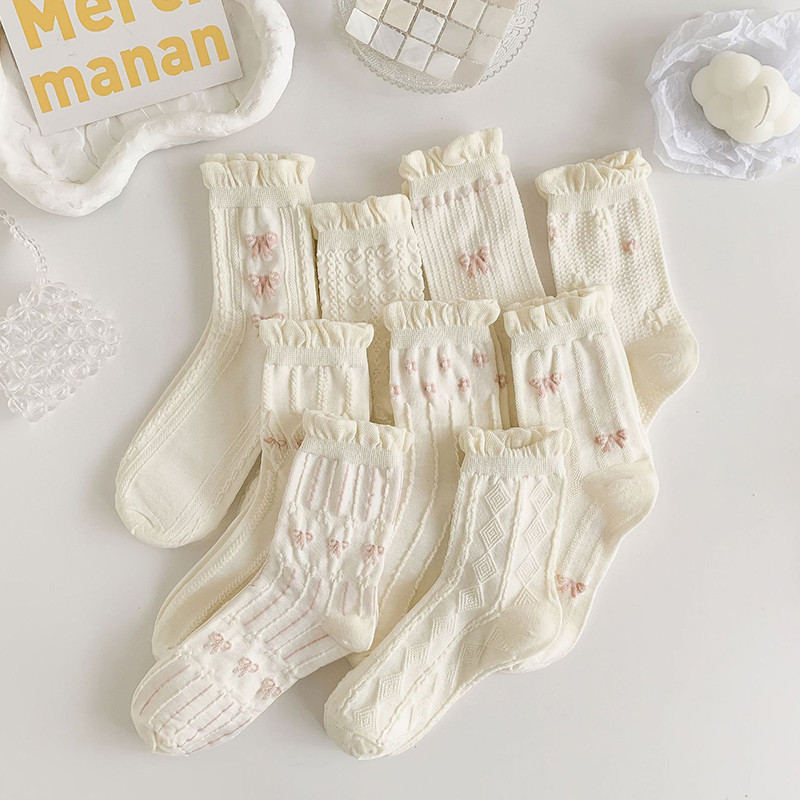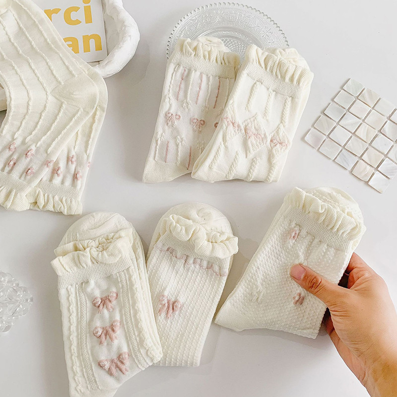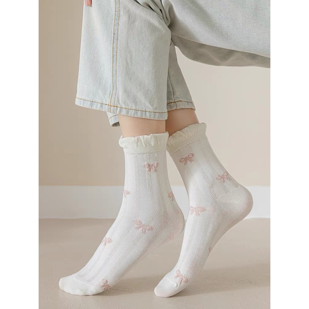 ถุงเท้าลูกไม้สีขาวขอบผู้หญิงบาง Ins เทรนด์กลางน่องถุงเท้าอเนกประสงค์ถุงเท้าน่ารัก