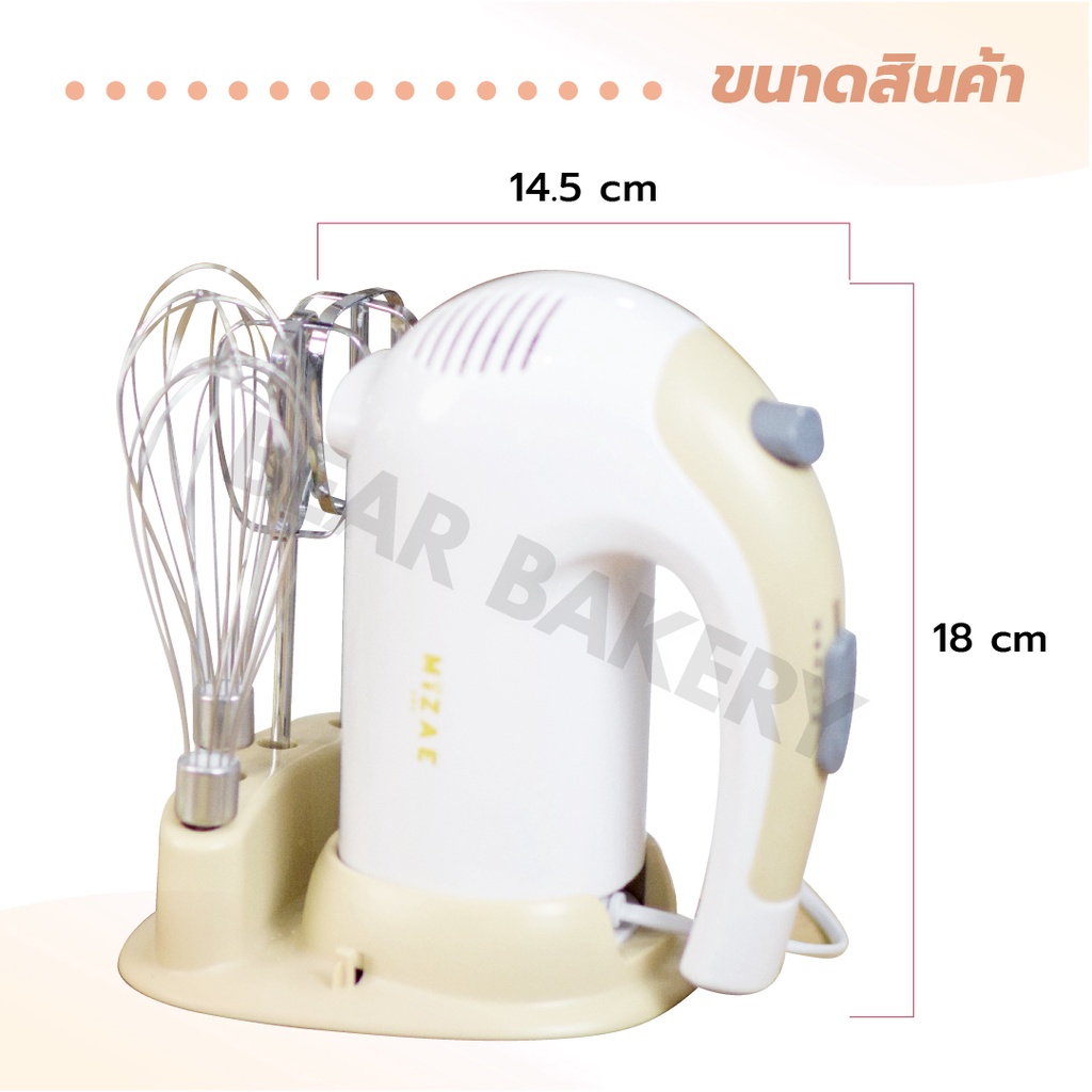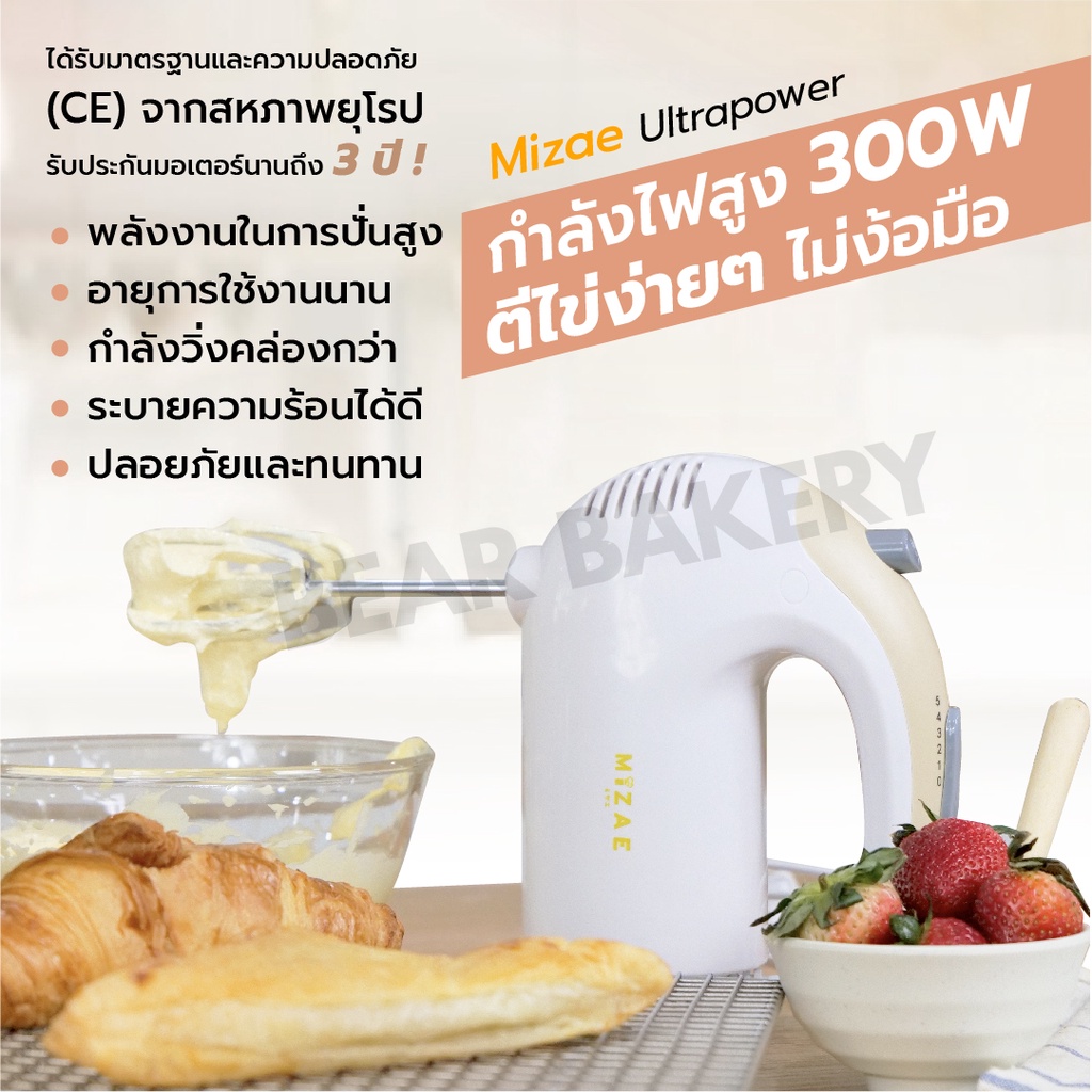 ✨ใหม่✨ เครื่องตีไข่ Mizae’ (มิเซ่) ULTRAPOWER 300W รุ่น EG01 พัฒนามอเตอร์ให้ใช้งานได้ยาวนานยิ่งขึ้นกว่ารุ่นเดิม ได้รับมาตรฐานและความปลอดภัยในการใช้งาน (CE) จากสหภาพยุโรป รับประกันมอเตอร์นานถึง 3 ปี ! พิเศษ แถมฟรี หัวตี 3 แบบ ชั้นวาง และที่แยกไข่แดงไข่ขาวแสตนเลส