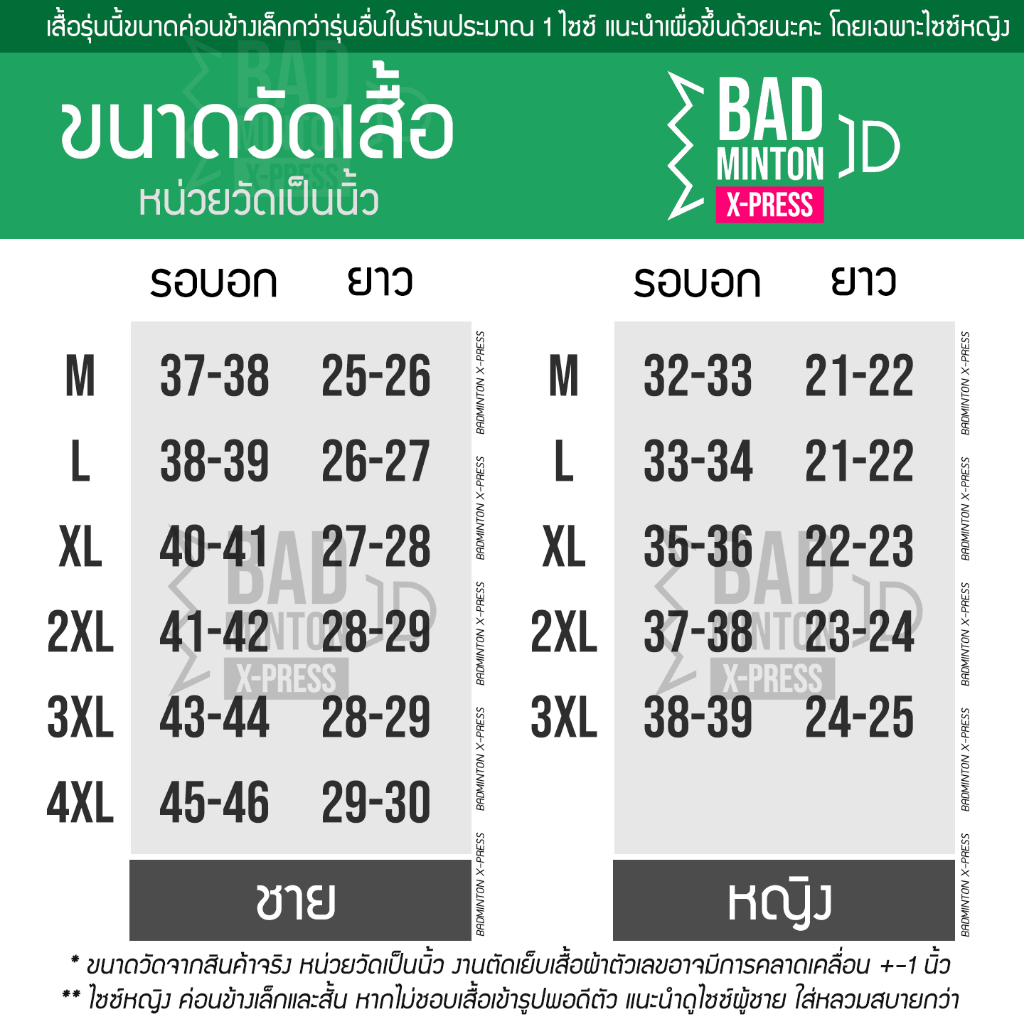 เสื้อแบดมินตันร้านเรานำเข้าสินค้ามาจากต่างประเทศ มาสต๊อกที่คลังสินค้าในไทยเพื่อจัดจำหน่ายในประเทศไทย สินค้าจัดส่งรวดเร็ว ได้ไวแน่นอน เสื้อมีการแยกไซซ์ทรงผู้ชาย และทรงผู้หญิง ไซซ์ผู้ชายจะเป็นทรงตรงเหมือนเสื้อกีฬาแบรนด์ไทยทั่วไป ส่วนไซซ์หญิงความยาวเสื้อจะสั้นกว่าไซซ์ชาย เอวคอดมากน้อยแล้วแต่รุ่น ช่วงแขนสั้นกว่าของผู้ชาย ลูกค้าหลายท่านไม่เคยใส่แบบนี้มาก่อน สั่งครั้งแรกอาจจะคิดว่าเป็นเสื้อเด็กรึเปล่า ซึ่งไม่ใช่นะคะ เป็นทรงของเสื้อหญิงโดยเฉพาะ แนะนำลูกค้าเช็คไซซ์ที่เหมาะสมกับตัวเองจากตารางไซซ์ก่อนนะคะ มีภาพตารางไซซ์อยู่ท้ายสุด (สินค้าเปลี่ยนไม่ได้)