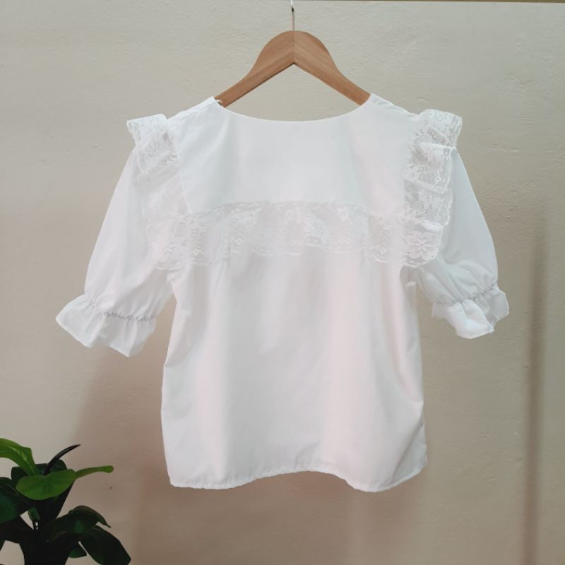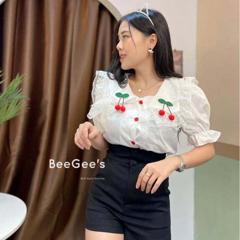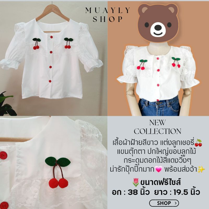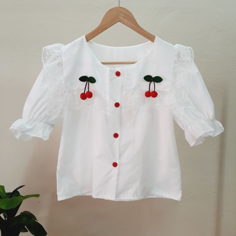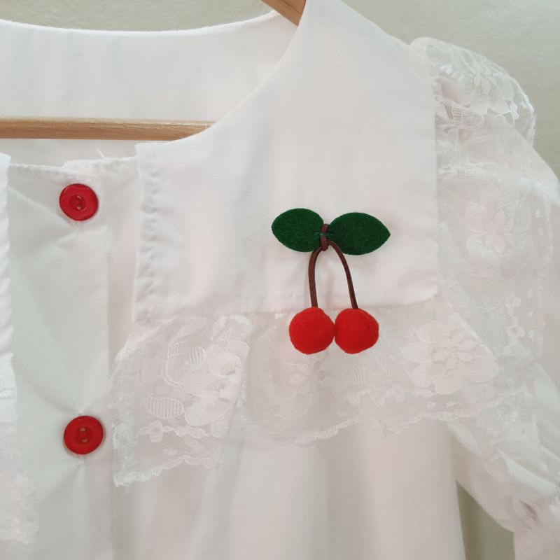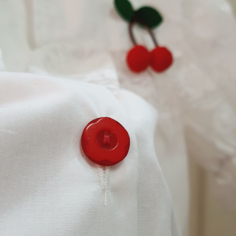 รุ่นนี้เป็นงานคอปกสีเหลี่ยมแต่งขอบระบายลูกไม้ ประดับด้วยลูกเชอรี่ สองข้างน่ารักมากๆเลย ด้านหลังเหมือนเป็นปกทหารเรือ กระดุมด้านหน้าแกะได้ทุกเม็ด กระดุมเป็นลายดอกไม้สีแดงวิ้งๆ✨