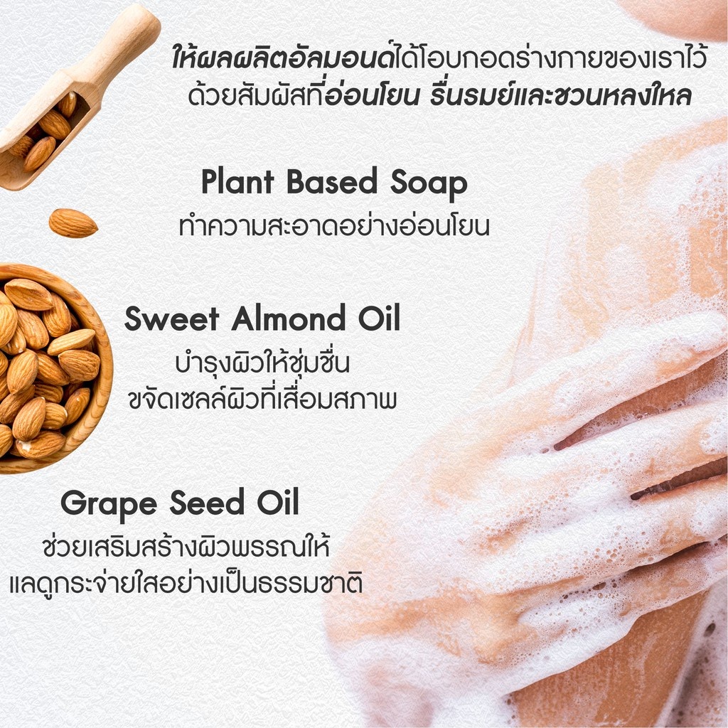 ทําให้เวลาอาบน้ําของคุณมีความสุขมากขึ้น อัลมอนด์มีคุณสมบัติในการให้ความชุ่มชื้นและช่วยขจัดสิ่งสกปรกได้เป็นอย่างดี เพราะเมื่อน้ํามันสัมผัสกับน้ําจะกลายเป็นครีมนมชั้นดีที่สามารถช่วยบํารุงและเติมความชุ่มชื้นได้ในขณะที่ยังล้างออกได้ง่าย