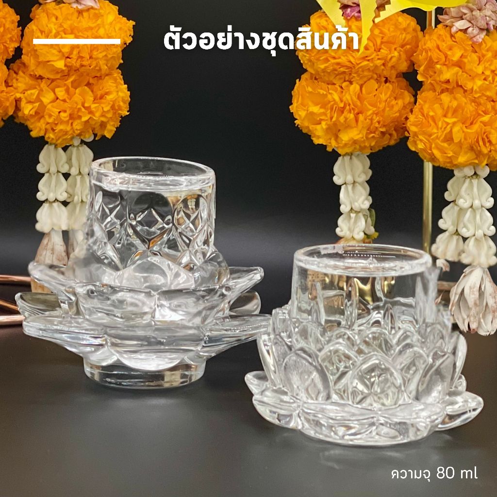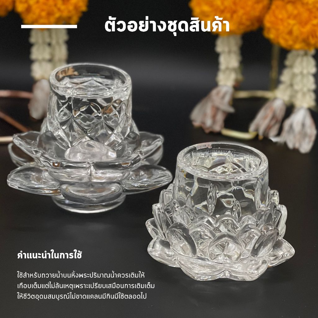 ชุดแก้วมงคลฐานดอกบัว ใช้สำหรับถวายน้ำบนหิ้งพระ การถวายน้ำบนหิ้งพระ ปริมาณน้ำในแก้วควรเติมให้เกือบเต็มแต่ไม่ล้นเพราะการเติมน้ำถวายพระเปรียบเสมือนกับการเติมเต็มให้ชีวิตมีความอุดมสมบูรณ์ไม่ขาดแคลน มีกินมีใช้ตลอดไป