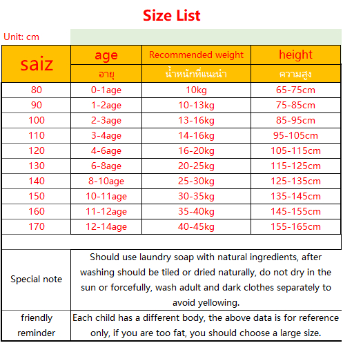 หมายเหตุ: หากเด็กอ้วนให้เลือกขนาดที่ใหญ่กว่าหนึ่งขนาด