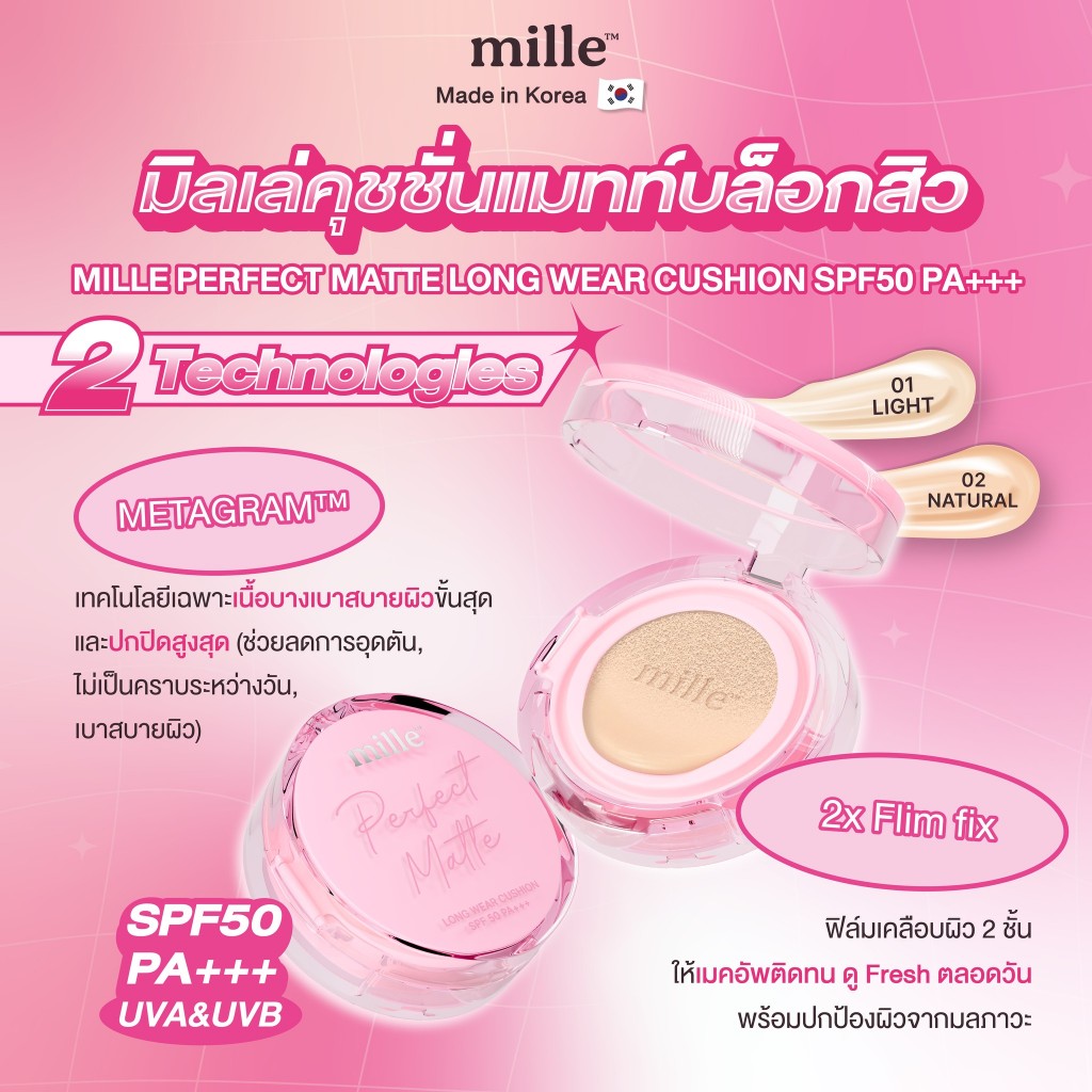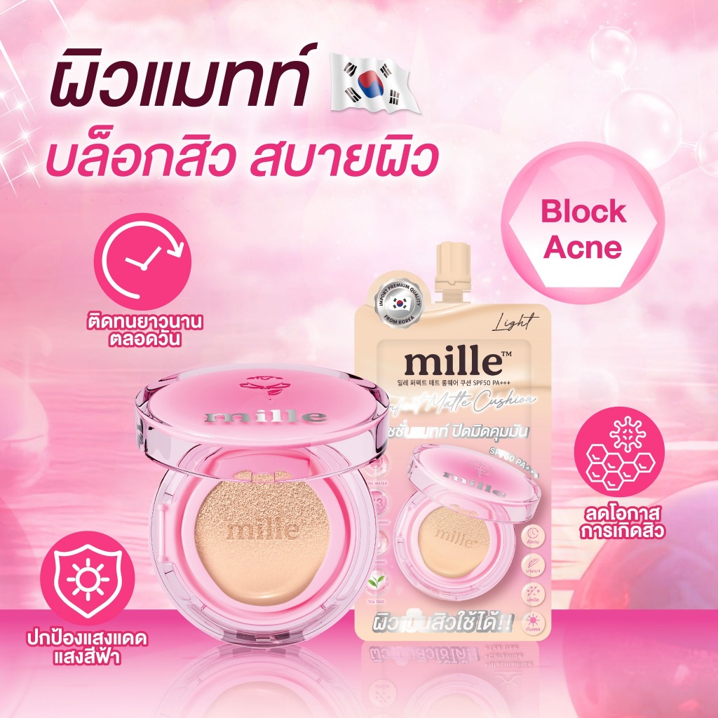 สุดของการปกปิดพร้อมเบลอผิวอย่างไร้ที่ติด้วย Mille Perfect Matte Long Wear Cushion SPF50 PA+++ คุชชั่นแมทท์บล็อกสิวด้วย 3 ฟังก์ชั่นตอบโจทย์ทุกงานผิวเมย์โคโคทั้งกันแดด บล็อกสิว และสบายผิว ที่ปกป้องผิวแบบขั้นสุดด้วยเทคโนโลยี Air Weight พร้อม SPF50 PA+++ ช่วยเพิ่มความยืดหยุ่นและความชุ่มชื้นของผิว พร้อมทั้งบรรเทาอาการอักเสบ ด้วยสูตรกันน้ำและเหงื่อ ช่วยให้เมย์โคโคมั่นใจได้กับทุกสถานการณ์ปกป้องมลภาวะและรังสียูวี รวมถึงแสงสีฟ้า เหมาะสำหรับผิวแพ้ง่าย ลดการเกิดสิวใหม่ ช่วยให้ผิวกระจ่างใสและมีสุขภาพดีขึ้นอีกด้วยค่ะ