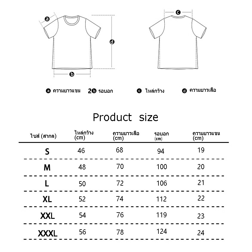 XXXL: รอบอก 44.8″ ยาว 28.3″ ไหล่กว้าง 19.6″ ความยาวแขน 9.4″