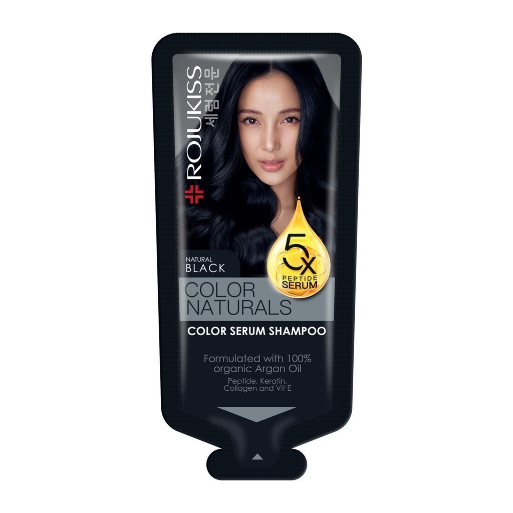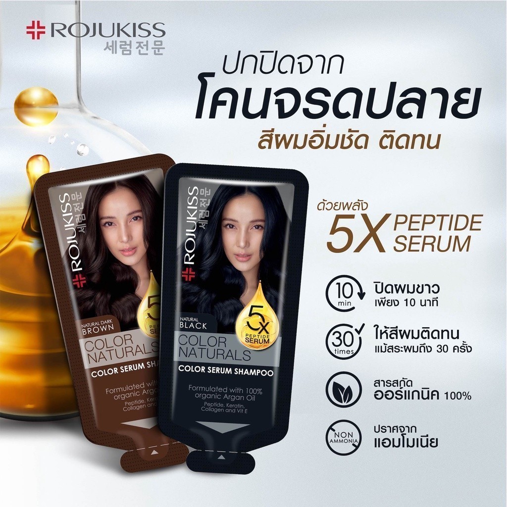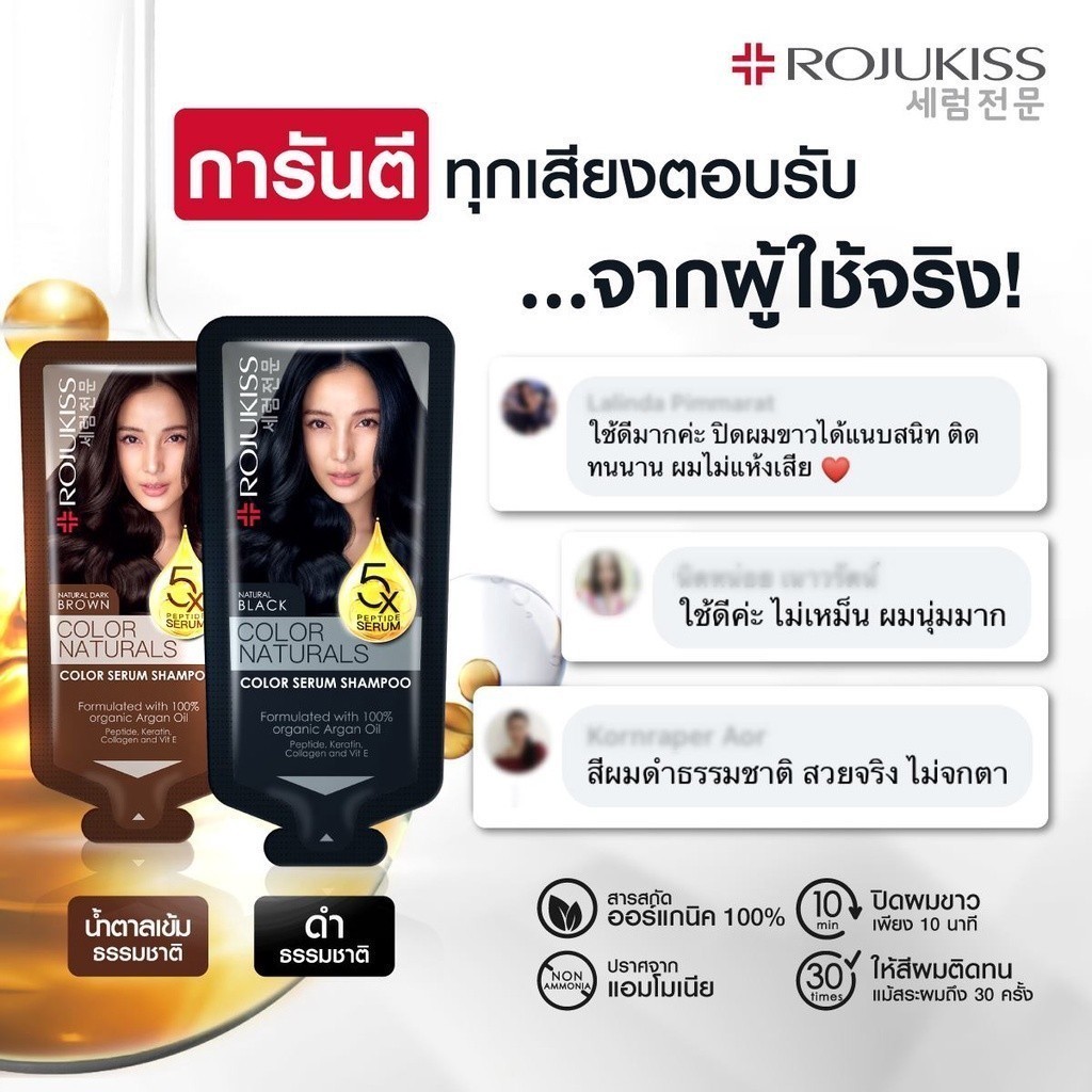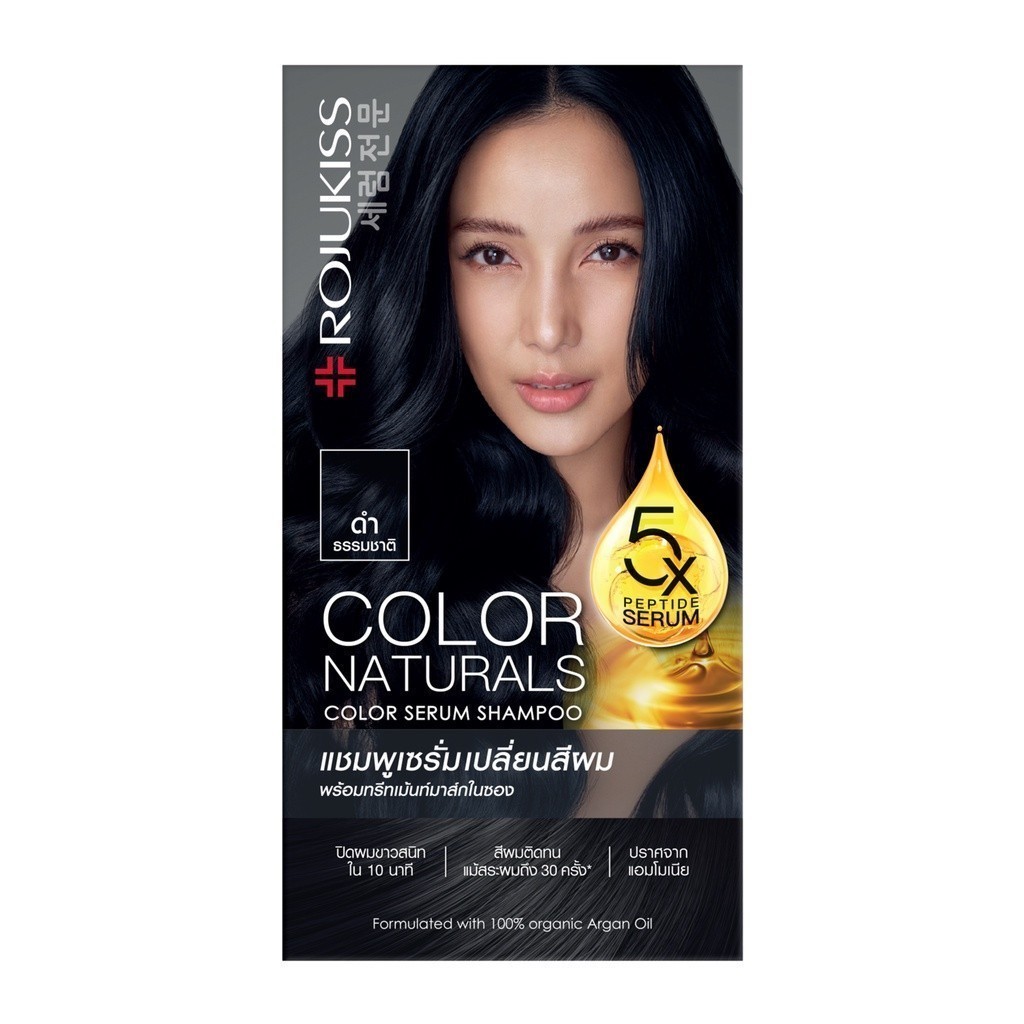 โรจูคิส คัลเลอร์ แนทเชอรัลส์ เซรั่ม แชมพู ดำธรรมชาติ ปิดผมขาวได้สนิท – ติดง่าย ตินทนนาน – กลิ่นหอม – ปราศจากแอมโมเนีย เปลี่ยนสีผมใหม่ด้วยตัวเองได้ง่ายๆ เพียงแค่การสระ สีผมอิ่มชัด ติดง่าย ติดทนนาน มีกลิ่นหอม ทั้งเปลี่ยนสี ทั้งบำรุงครบจบในซองเดียว นวัตกรรมใหม่ของโรจูคิส แชมพูเซรั่มเปลี่ยนสีผม ผสานพลัง 5x peptide ช่วยให้เส้นผม แข็งแรงสุขภาพดี ไม่ขาดหลุดร่วงง่าย ผมนุ่ม เงางามอย่างเป็นธรรมชาติ พร้อมทั้งการบำรุงขั้นสุด ปิดผมขาวได้สนิท เพียง 10 นาที สีผมติดทนนานแม้จะสระผมถึง 30 ครั้ง ทั้งปกปิดทั้งบำรุง ครบจบในซองเดียว เส้นผมนุ่มสลวย ดำสนิท ดูเปล่งประกายและเงางามอย่างเป็นธรรมชาติ