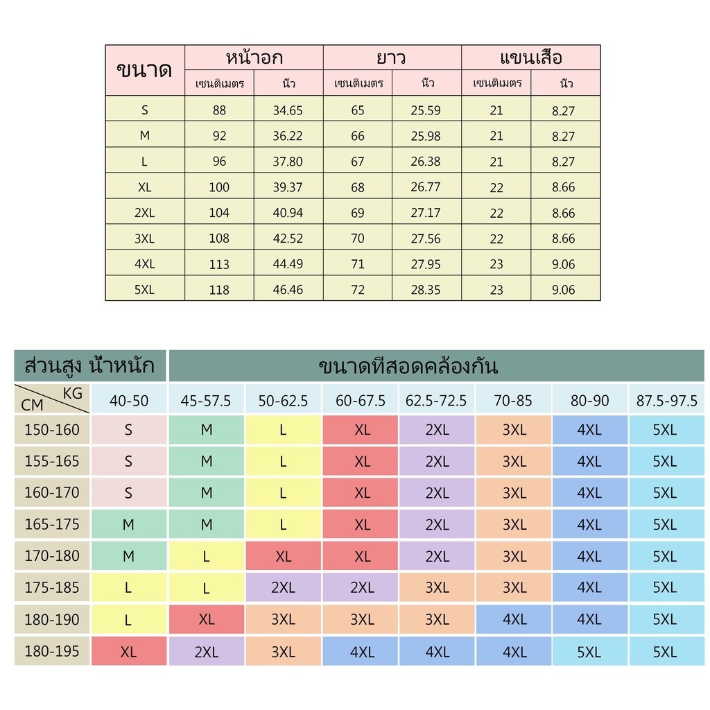 5XL: อก: 46″, ยาว: 29″, เหมาะสำหรับน้ำหนัก 87.5-97.5kg