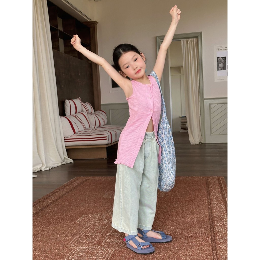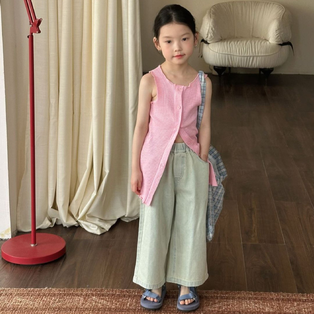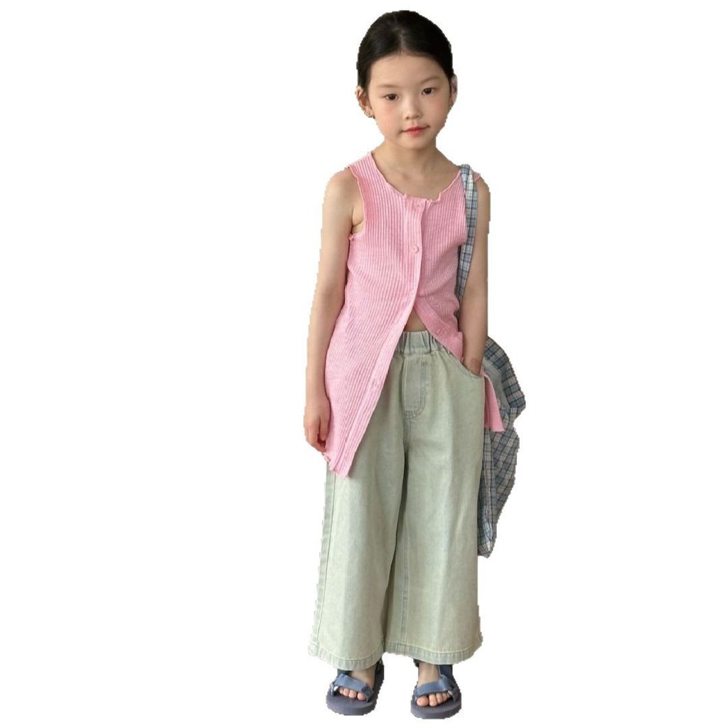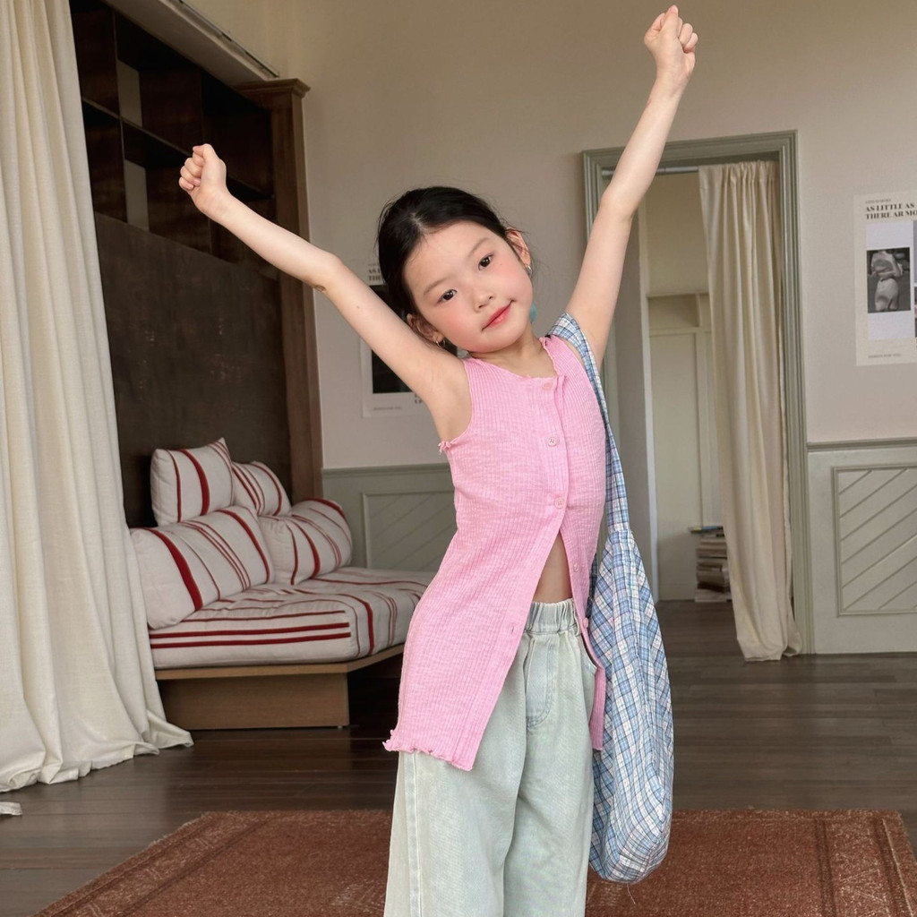 2025เสื้อผ้าเด็กใหม่ฤดูร้อนเสื้อผ้าเด็กเกาหลีเด็กผู้หญิงเสื้อกั๊กยาวปานกลางเสื้อกล้ามกระดุมแถวเดียวแขนกุดสไตล์ตะวันตก