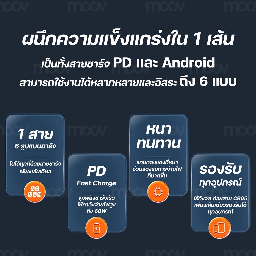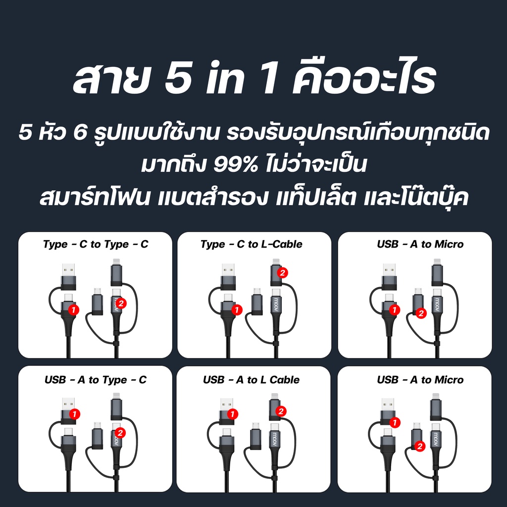 ・ Moov CB04 และ CB05 สายชาร์จ 5 in 1 เพียงเส้นเดียว สามารถใช้งานได้หลากหลาย