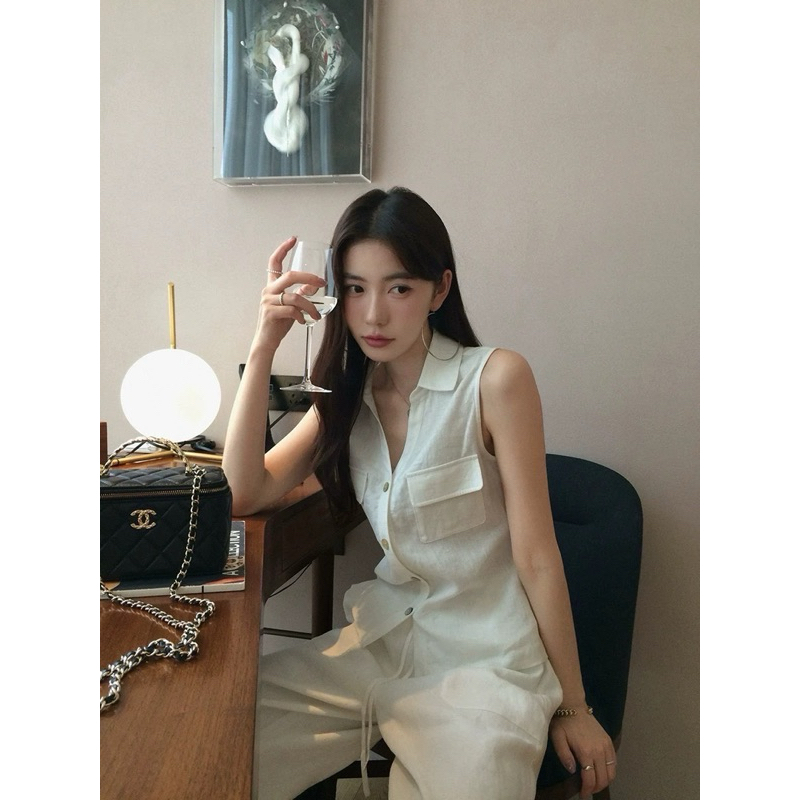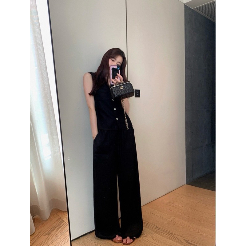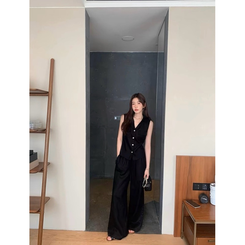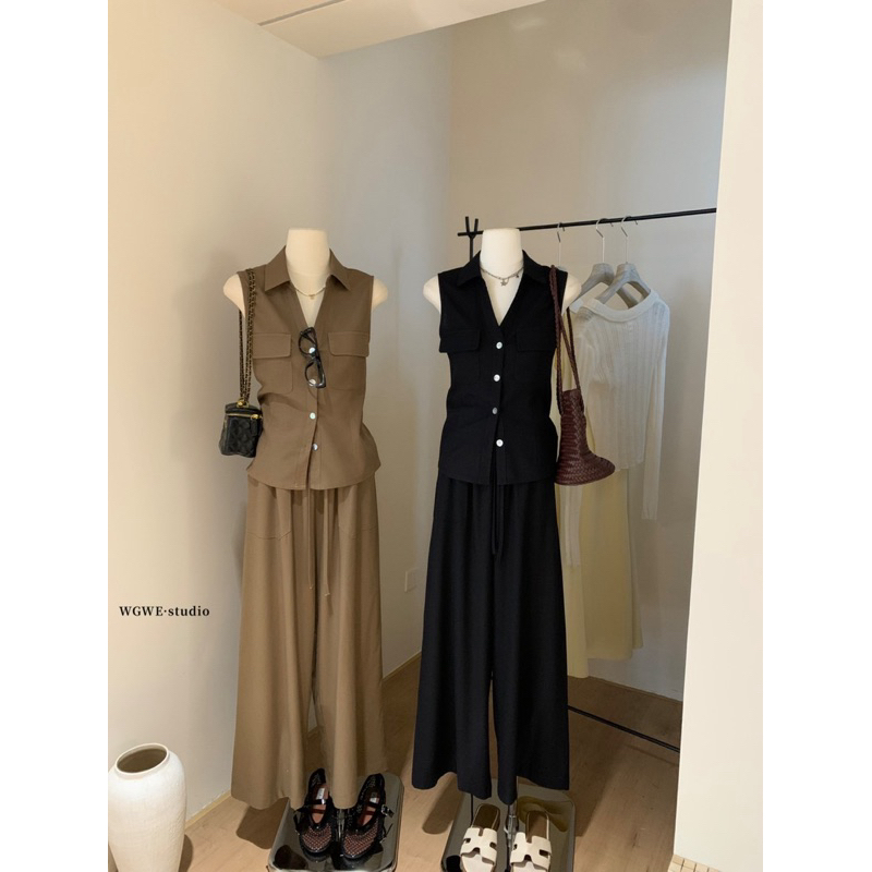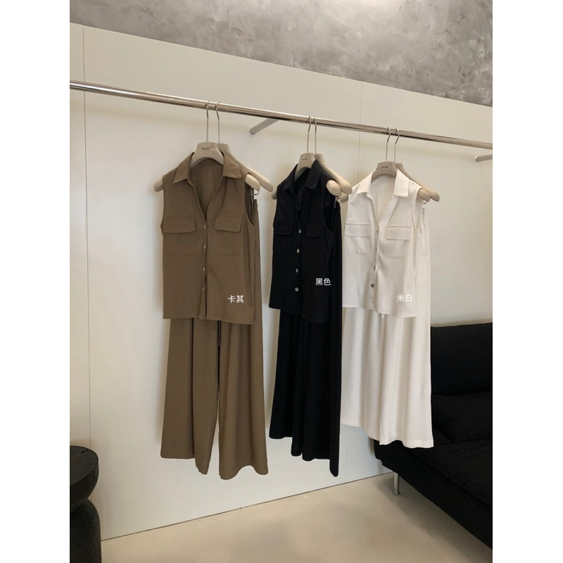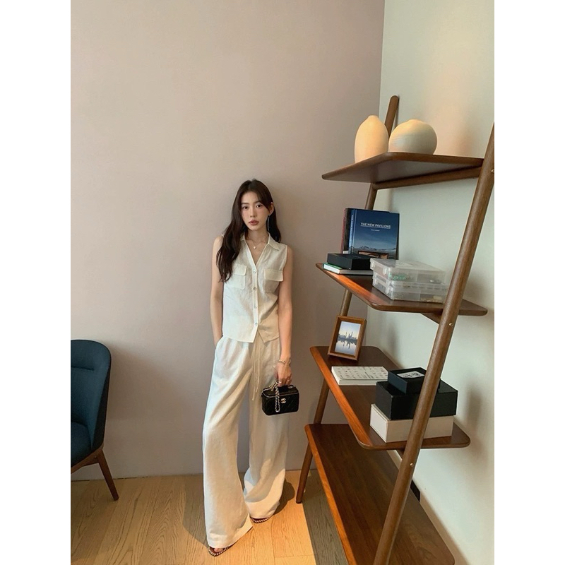 5397# set 2 pcs เสื้อแขนกุดคอปกกระดุมหน้า + กางเกงขายาวสมอคหลัง มีเชือกรูดเอว มีกระเป๋าล้วงข้าง