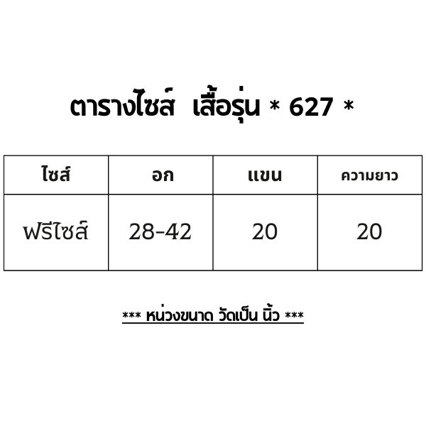 ฟรีไซส์ = รอบอก 28-42นิ้ว แขนยาว 20นิ้ว เสื้อยาว 20นิ้ว