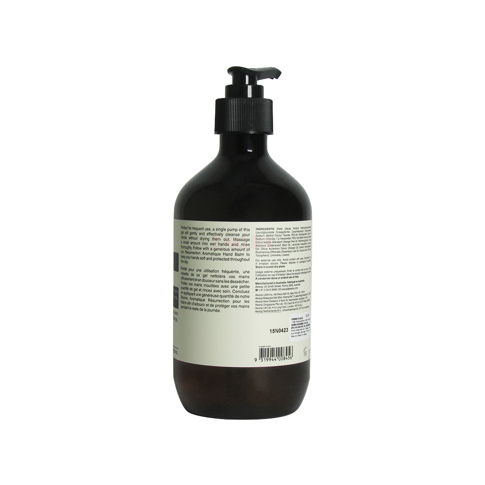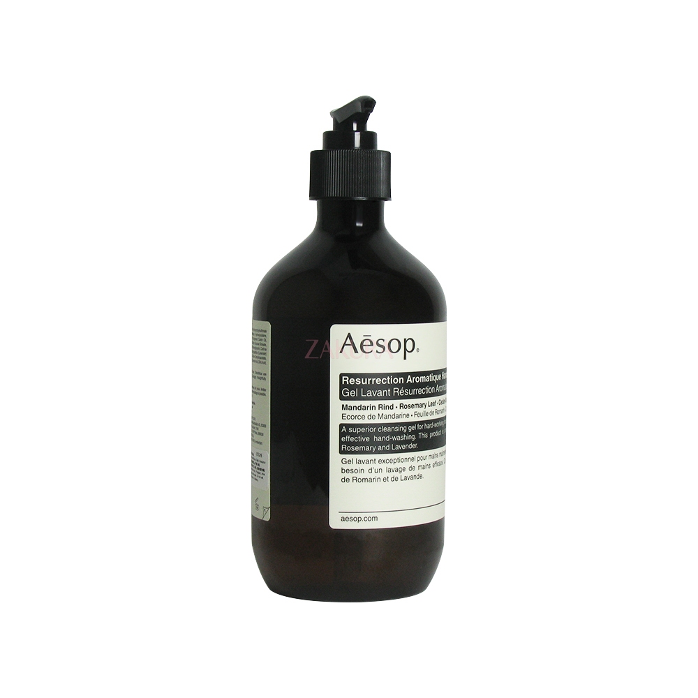 Aesop Resurrection Aromatique Hand Wash.The gentle formula effectively cleanses dirt and impurities from your hands without drying them out. Enriched with essential oils of orange, rosemary, and lavender to moisturize and soften your hands.