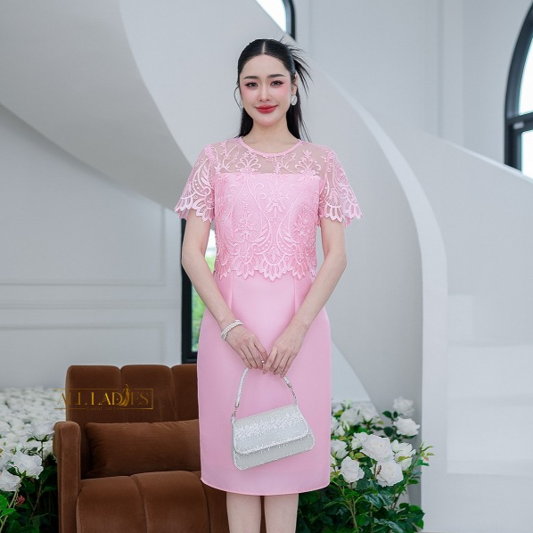 เดรสผ้าไหมลูกไม้แต่งเลื่อมลายไทยกนก : ชมพู(ชมพูหวาน) / ฟ้า