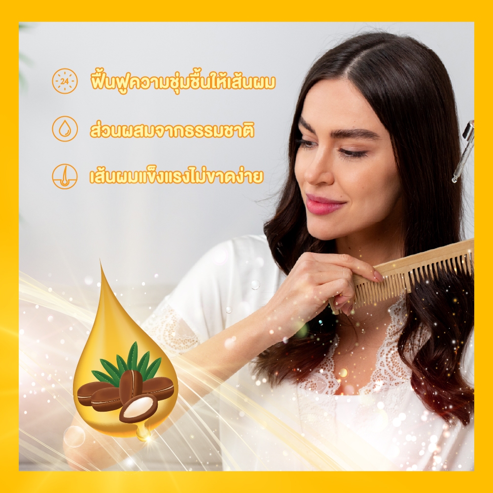 2. เพิ่มความชุ่มชื้น – ผสานน้ำมันอาร์แกนที่ช่วยให้เส้นผมนุ่มลื่น มีน้ำหนัก และเงางาม ไม่ชี้ฟู